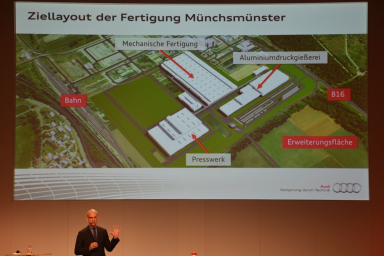 Im Industriepark Münchsmünster entsteht ein Audi-Kompetenzzentrum für die Produktion von Karosserie-Strukturbauteilen aus Aluminiumdruckguss, von warm- und kaltumgeformten Pressteilen sowie von Fahrwerkkomponenten. Die neue Fertigung, in die das Unternehmen einen Betrag im unteren dreistelligen Millionenbereich investiert, ist nach eigenen Angaben „ein weiterer Baustein in der Wachstumsstrategie von Audi“ und soll zudem das Stammwerk in Ingolstadt entlasten.