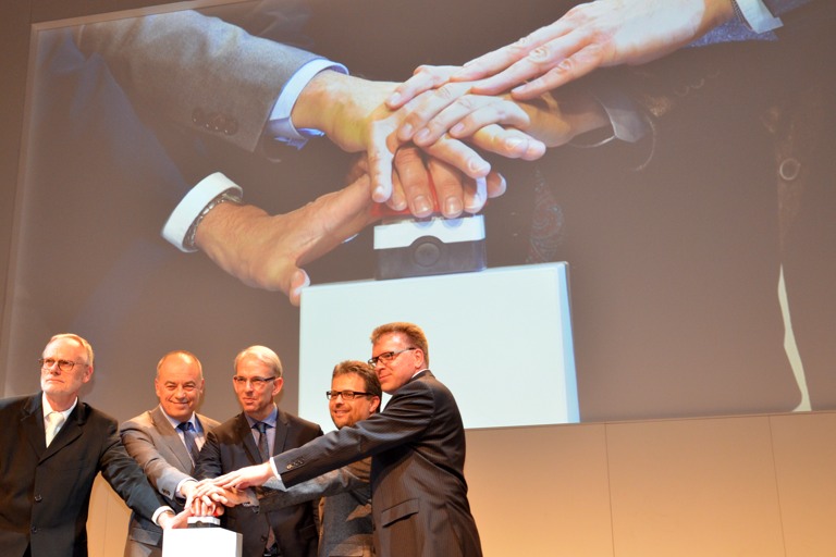 Symbolischer Moment: Mit dem gemeinsamen Drücken des Startknopfes war der neue Audi-Standort dann auch offiziell eröffnet.
