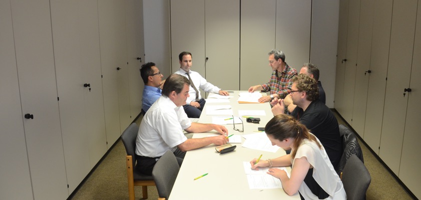 Abschließende Wahlausschuss-Sitzung: Albert Gürtner (FW, von links unten, im Uhrzeigersinn), Michael Franken (AUL), Landratsamt-Jurist Niklas Hafenrichter, Wahlleiter Heinz Taglieber, Markus Käser (SPD), Florian Schranz (CSU), Vize-Wahlleiterin Konstanze Erdle. (Foto: Zell)