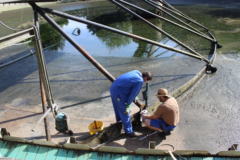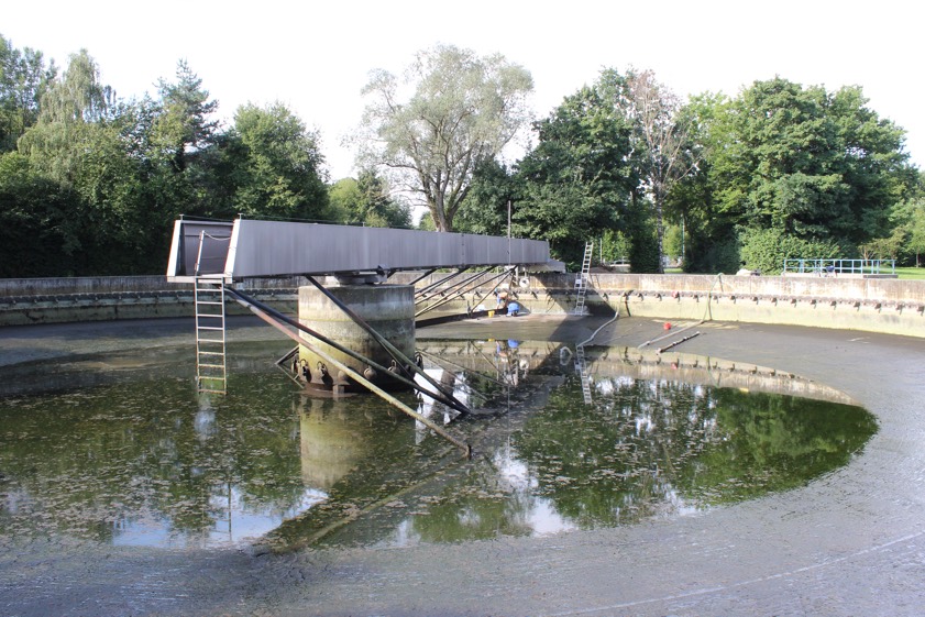 „Dieser große Schieber ist im Normalbetrieb nicht frei zugänglich, er transportiert unter Wasser abgesunkenen Belebtschlamm in das Mittelbauwerk des Nachklärbeckens“, erklärt Hollenberger. Unter Belebtschlamm verstehen die Experten die Bakterienmasse, die das Abwasser reinigt. Vom Mittelbauwerk wird der abgesetzte Schlamm dann zurück in das Belebungsbecken gepumpt, es entsteht ein Kreislauf.