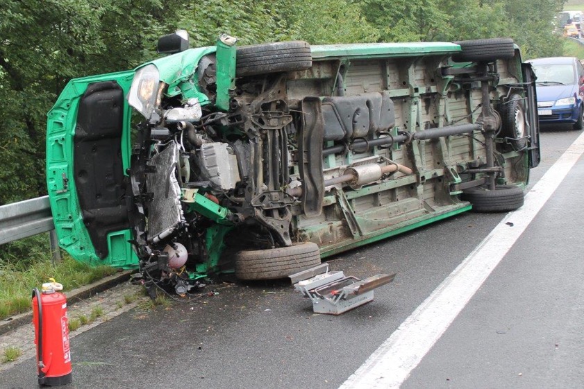 Kleintransporter krachte in die Mittelleitplanke und kam umgekippt auf der Standspur zum Liegen. Die drei Insassen hatten wohl einen Schutzengel an Bord.