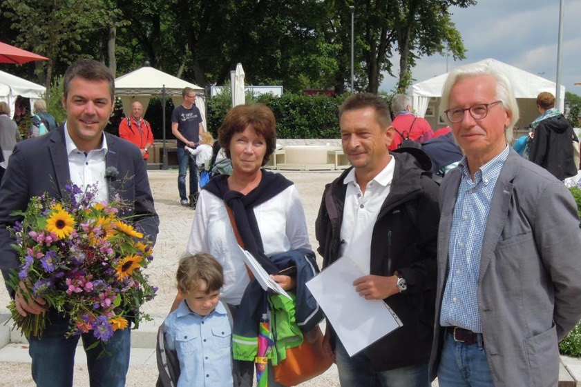 Begrüßt wurde das Trio von Bürgermeister Thomas Herker (SPD) und Gartenschau-Geschäftsführer Walter Karl, die einen großen Blumenstrauß, einen Gastronomie- und Theater-Gutschein sowie Eintrittskarten für die Landesgartenschau in Würzburg 2018 überreichten.
