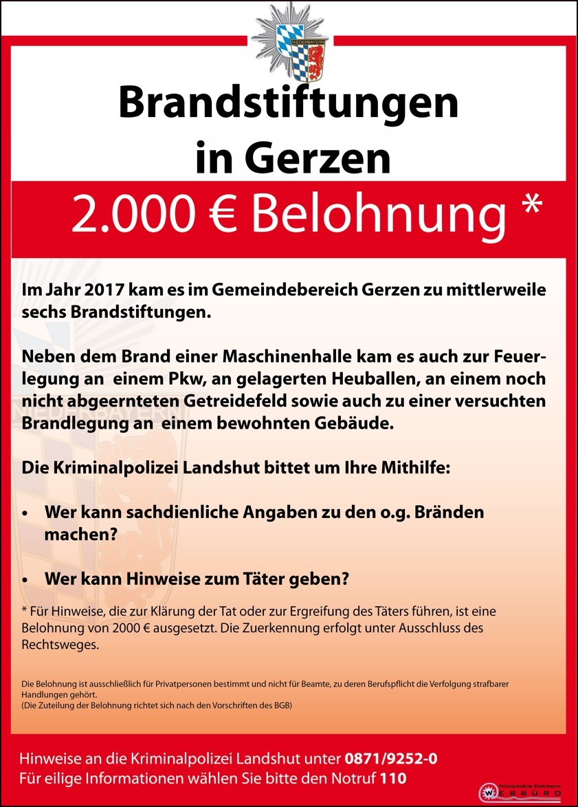 (ty) Seit Februar ist es im Gemeindebereich von Gerzen (Kreis Landshut) wiederholt zu Bränden gekommen – unter anderem in der Schloßparkstraße, in der Frontenhausener Straße, Reismühle, Rutting und in der Resenödstraße. Die Kripo geht mittlerweile davon aus, dass sämtliche Brände vorsätzlich gelegt worden sind. Trotz umfangreicher Ermittlungen ergab sich bislang aber noch kein Hinweis auf einen oder mehrere mögliche Tatverdächte. Die Kripo bittet nun die Bevölkerung um Mithilfe. Für Hinweise, die zur Ergreifung des Täters führen, wurde eine Belohnung in Höhe von 2000 Euro ausgesetzt. Hinweise nimmt die Kriminalpolizei Landshut unter der Rufnummer (08 71) 92 52 -0 oder jede andere Polizeidienststelle entgegen. Nachfolgend das Fahndungs-Plakat: