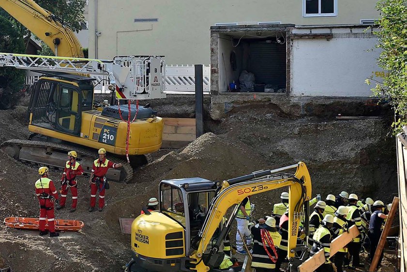 Nach Angaben der Feuerwehr waren aus bisher ungeklärter Ursache Bretter einer Spundwand gebrochen, während der Bauarbeiter gerade daneben beschäftigt war. Durch das nun herausrutschende Erdreich und Kies sei er bis zum Bauch begraben worden. Ein weiterer Arbeiter habe den Unfall bemerkt und einen Notruf abgesetzt, berichtet die Feuerwehr. Anschließend habe der Kollege versucht, den Verunglückten mit Hilfe eines Minibaggers freizuschaufeln – „jedoch rutschte immer wieder neues Material nach“, heißt es von der Feuerwehr.