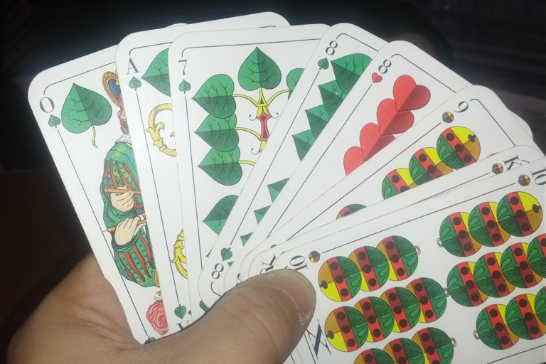 9.30 Uhr: "Ablenkung im Zug", schreibt Käser und hat offensichtlich schon das erste Problem: "Ich bekomme zu viel Grün!" Ob das für den Pfaffenhofener Obersozi aus politischer Sicht schwierig ist, darüber kann nur spekuliert werden. Immerhin geht es ja zum Nachhaltigkeitspreis… Wie problematisch die vielen Grün aus kartenspielerischer Sicht sind, können wir indes nicht beurteilen, denn wir wissen ja nicht, was gespielt wird.