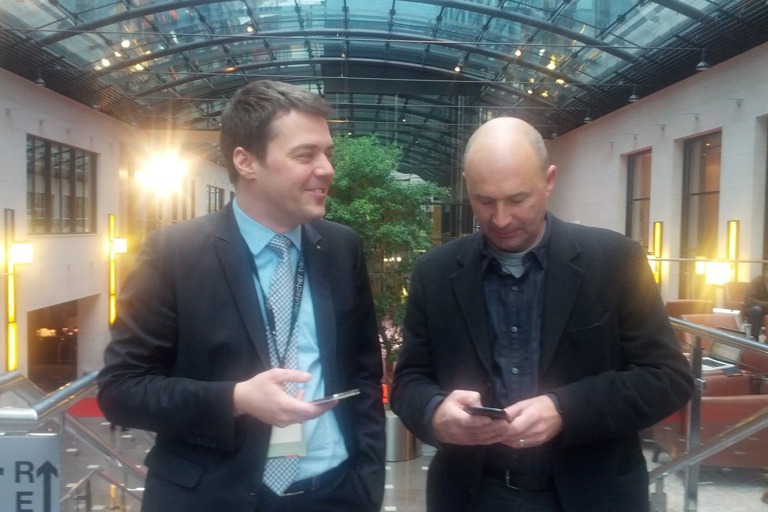 14.13 Uhr: Kongresspause. Bürgermeister Thomas Herker und Stadtbaumeister Gerald Baumann schauen, was es Neues gibt. Laut Käser verfolgen sie auch unseren Liveticker, denn Pfaffenhofen-today.de ist ebenso via Smartphone abrufbar.