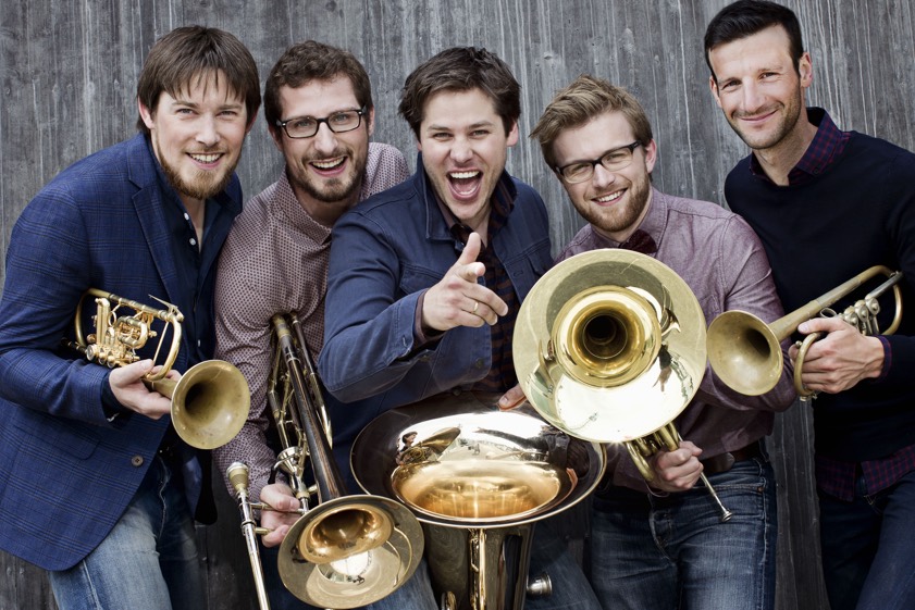 In ihrem Programm „verrückt – verdreht – verschoben“, das sie in Pfaffenhofen präsentieren, bitten Konrad Müller (Trompete), Hannes Oblasser (Trompete), Matthias Krön (Horn), Sebastian Sager (Posaune) und Fabian Heichele (Tuba) sprichwörtlich zum Tanz und treten dabei wahrlich nicht mit leisen Sohlen auf. Renaissance-Klänge von Michael Praetorius stoßen auf skurrile Geniestreiche des alpenländischen Jazz-Exoten Werner Pirchner. Beethoven’sche Ländleridylle ist im burlesk-bajuwarischen Gewand von Jan Koetsier zu erleben. Und avantgardistische Alphorn-Melodien österreichischer Herkunft treffen auf orientalisch-exotische Kreationen von Hans Kröll.