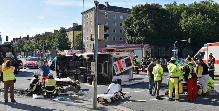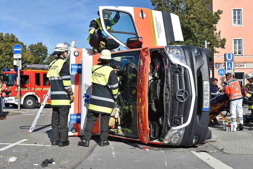 (ty) Beim Zusammenstoß zwischen einem Pkw und einem Rettungswagen sind gestern Vormittag in München-Ramersdorf fünf Personen verletzt worden, davon ein 30-Jähriger Sanitäter schwer. Die Kollision war so heftig, dass das Einsatz-Fahrzeug umkippte und noch gegen einen Kleintransporter prallte. Der Sachschaden wird auf mehrere zehntausend Euro beziffert.