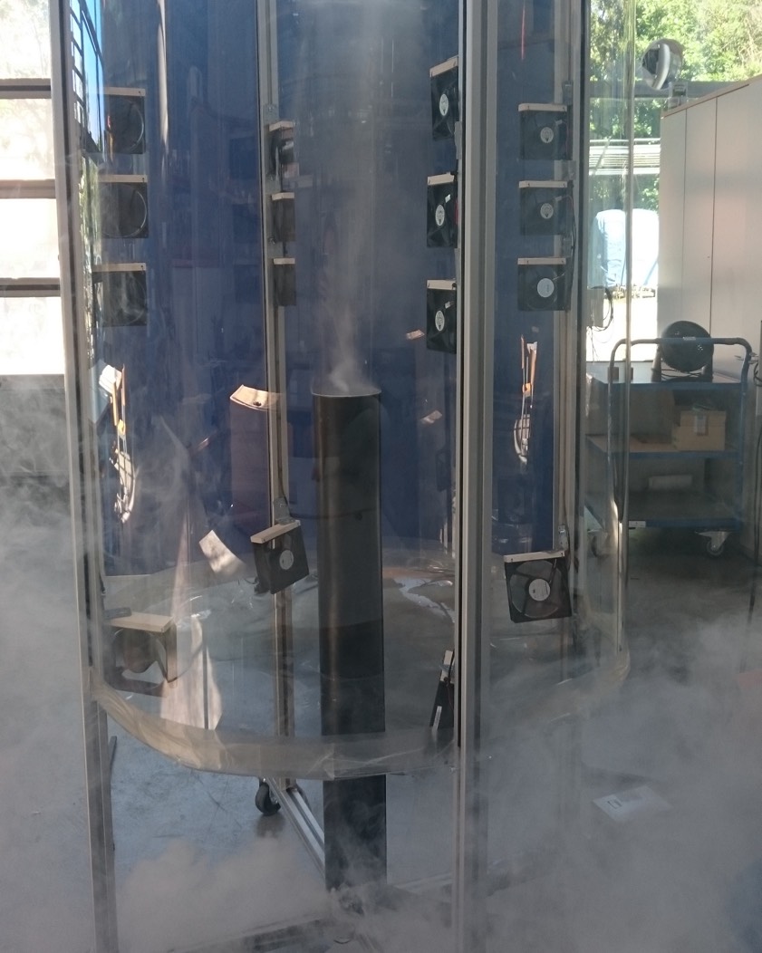 „Zunächst konstruierten sie aus einem quaderförmigen, aufrechtstehenden Aluminium-Gestell und durchsichtigen Polycarbonat-Platten einen abgeschlossenen Raum, in dem der Wirbelsturm frei von äußeren Einflüssen entstehen konnte“, wird dazu erklärt. „Mithilfe einiger PC-Lüfter, die sie an den Innenseiten des abgeschlossenen Raums in einem bestimmten Winkel montierten, erzeugten die Studierenden nun einen kreisförmigen Luftstrom, den sie von einem weiteren Lüfter nach oben aus dem Versuchsgehäuse absaugen ließen.“ Um den so entstandenen Mini-Tornado auch sichtbar zu machen, leiteten sie von unten Nebel in den Wirbelkern ein.