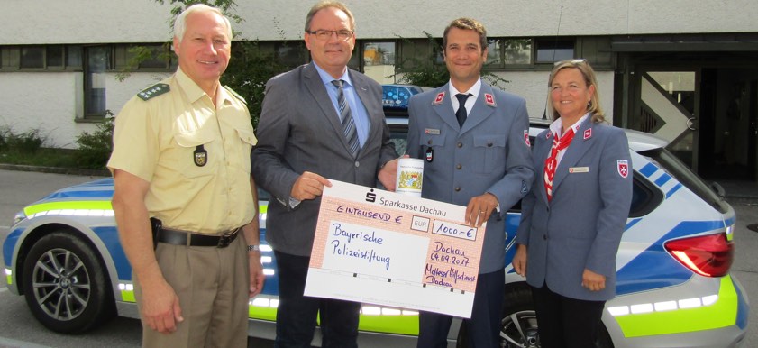 (ty) Am 22. Juli hatte das Kriseninterventionsteam der Malteser in Dachau sein fünfjähriges Bestehen gefeiert. In diesem Rahmen war ein Spendenaufruf für die bayerische Polizeistiftung (www.bayerische-polizei-stiftung.de) gestartet worden, um die gute Zusammenarbeit zwischen den beiden Organisationen hervorzuheben. Gabriele Lutter und Graf Georg von Hundt überreichten stellvertretend für die Malteser einen symbolischen Scheck über die gesammelten 1000 Euro an den Vize-Chef der Dachauer Polizeiinspektion, Albert Kapitza, und den örtlichen Polizei-Personalrat, Stefan Kemptner. Die Übergabe fand bei der Inspektion Dachau statt, verbunden mit einem Dank für die Zusammenarbeit, Hilfe und Unterstützung im Einsatz.