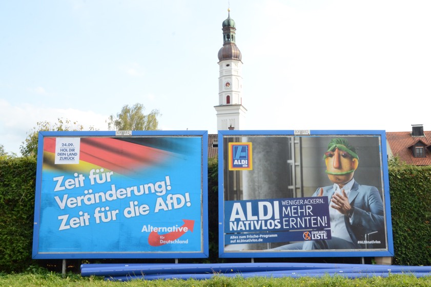 (ty) Der Discounter Aldi mischt frech im Bundestags-Wahlkampf mit – allerdings in eigener Sache und keinesfalls frei von Ironie. Zu einem kuriosen Aufeinandertreffen kommt es dabei zum Beispiel in Pfaffenhofen-Niederscheyern. Hier stehen zwei Großflächen-Plakate Seite an Seite. Links: Werbung der "Alternative für Deutschland" (AfD). Rechts: Reklame von Aldi unter dem Motto "Aldinativlos". Und während die AfD "Zeit für Veränderung!" proklamiert, verspricht Aldi-Süd: "Weniger ackern. Mehr ernten!" Ein Rezept gegen "immer dieselben Wahlkampf-Reden" hat der Discounter übrigens auch, wie aus einem Video zu der "Aldinativlos"-Kampagne hervorgeht.
