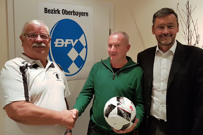 (ty) Dem bayerischen Fußballverband (BFV) ist sehr daran gelegen, dass der Spielverlauf möglichst vieler Partien im Amateurbereich „getickert“ wird. So kann jedermann über die BFV-App live mitverfolgen, was in einem Match gerade passiert und wie es steht. Der ST Scheyern kam dieser Aufforderung des BFV in der vergangenen Saison 2016/17 in vorbildlicher Weise nach und hat Spielverlauf sowie Ergebnisse aller Partien im Herrenbereich getickert. Als kleines Dankeschön hierfür überreichten BFV-Kreischef Horst Kaindl (Foto oben, links) und BFV-Bezirkschef Robert Schraudner (rechts) einen hochwertigen Spielball an Sepp Schreyer (Mitte), den Scheyerner Fußball-Abteilungsleiter.