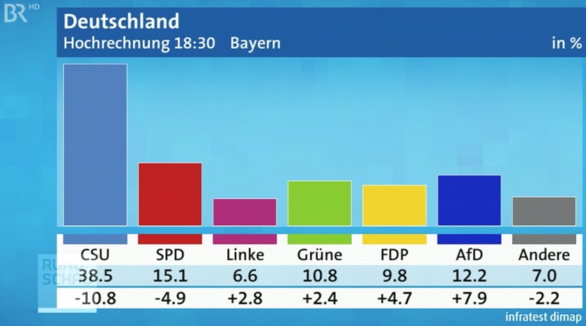 18.35 Uhr: In der "Rundschau" hat das Bayerische Fernsehen eine Hochrechnung (Stand: 18.30 Uhr) für den Freistaat veröffentlicht. Demnach kassiert die CSU eine mächtige Watsch, verliert 10,8 Prozentpunkte auf 38,5 Prozent. Die SPD verliert fast fünf Prozentpunkte, kommt auf 15,1 Prozent. Die AfD gewinnt 7,9 Prozent und erreicht 12,2 Prozent. (Screenshot: BR)