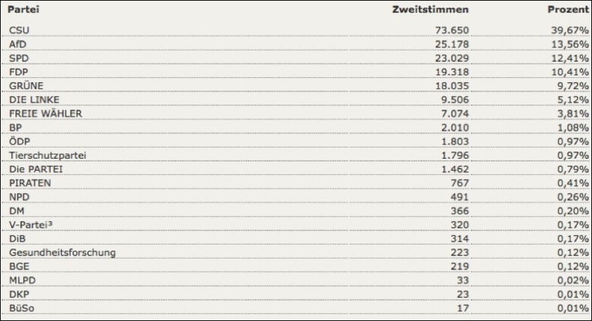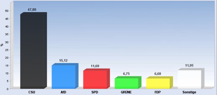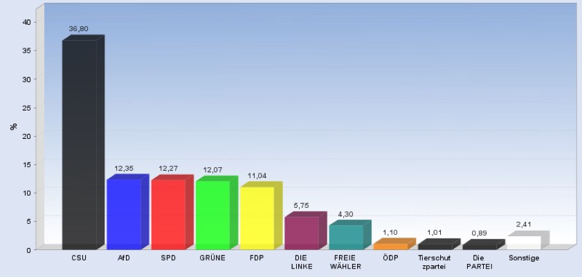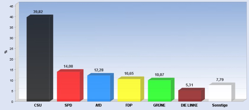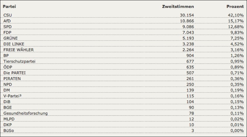 22.25 Uhr: Die Auswertung der Zweitstimmen für den gesamten Wahlkreis ergibt nach dem vorläufigen Ergebnis für die CSU 39,67 Prozent – das sind gut zwölf Prozent weniger als bei der Bundestagswahl 2013. Die AfD holt 13,56 Prozent, die SPD folgt mit 12,41 Prozent. Für die FDP geht es auf 10,41 Prozent, dahinter die Grünen (9,72 Prozent, die Linke (5,12), die Freien Wähler (3,81), die Bayernpartei (1,08), die ÖDP (0,97 Prozent) und die Tierschutzpartei (0,97). Hier die komplette Verteilung der Zweitstimmen im hiesigen Wahlkreis in der Zusammenfassung.