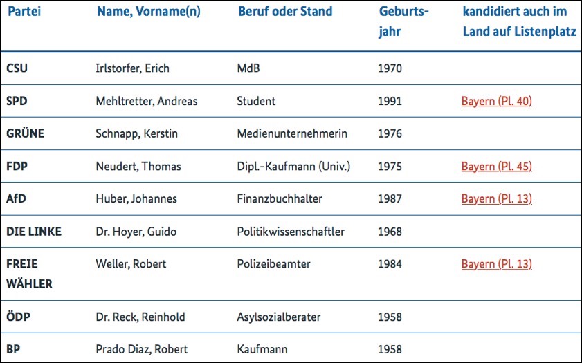 15.36 Uhr: Von den neun Kandidaten, die sich im hiesigen Wahlkreis um das Direkt-Mandat bewerben, schafft nur derjenige sicher den Einzug in den Bundestag, der die meisten Stimmen erhält. Für vier Bewerber gibt es aber noch eine zusätzliche Chance, denn sie kandidieren zusätzlich auf den Listen ihrer jeweiligen Partei. Das sind Andreas Mehltretter (SPD), Thomas Neudert (FDP), Johannes Huber (AfD) und Robert Weller (Freie Wähler). Hier der Überblick (Quelle: bundeswahlleiter.de)