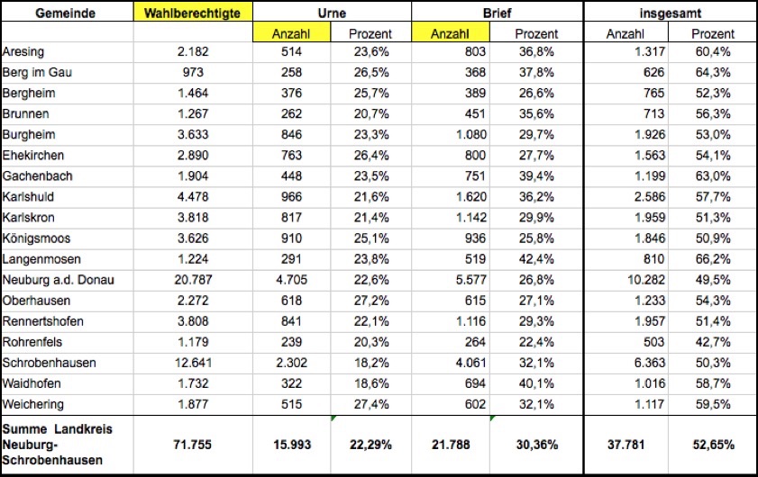 13.42 Uhr: Aus dem Neuburger Landratsamt wurden aktuelle Zahlen zu der – heute bislang bis 13 Uhr verzeichneten – Wahlbeteiligung im Landkreis Neuburg-Schrobenhausen veröffentlicht. Von den 71 755 Wahlberechtigten hatten demnach bis 13 Uhr bereits 37 781 ihre Stimme abgegeben, das entspricht bereits jetzt einer Wahlbeteiligung von 52,65 Prozent. Hier die Übersicht: