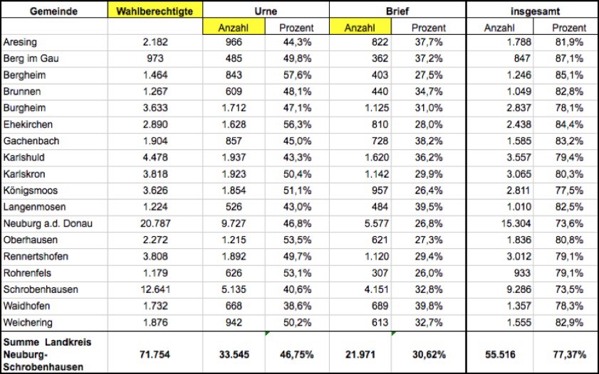 18.50 Uhr: Weitere Daten aus der Region. Das Neuburger Landratsamt hat soeben die Daten zur Wahlbeteiligung bis zur Schließung der Wahllokale um 18 Uhr im Landkreis Neuburg-Schrobenhausen veröffentlicht. Die Wahlbeteiligung liegt demnach bei knapp 77,4 Prozent. Hier die Übersicht zu den einzelnen Gemeinden.