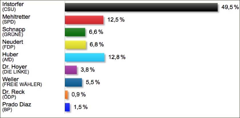 19.30 Uhr: In Baar-Ebenhausen kommt CSU-Mann Irlstorfer auf 43,4 Prozent und hat damit klar die Nase vorn. Dahinter AfD-Kandidat Huber mit gut 16 Prozent und SPD-Bewerber Mehltretter mit 14,11 Prozent. Bei den Zweitstimmen liegt die AfD mit 17,11 Stimmen als zweitstärkste Kraft hinter der CSU (39,48 Prozent), die SPD kommt auf knapp 14 Prozent. Die FDP darf sich über 9,76 Prozent freuen.