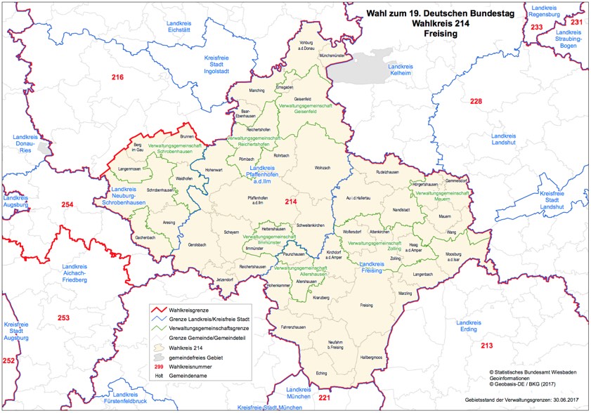 Der Bundestags-Wahlkreis 214 umfasst die Landkreise Pfaffenhofen und Freising sowie aus dem Kreis Neuburg-Schrobenhausen die Gemeinden Aresing und Schrobenhausen sowie die Verwaltungsgemeinschaft Schrobenhausen mit den Gemeinden Berg im Gau, Brunnen, Gachenbach, Langenmosen und Waidhofen. Hier eine Grafik des Wahlkreises, Quelle: www.bundeswahlleiter.de