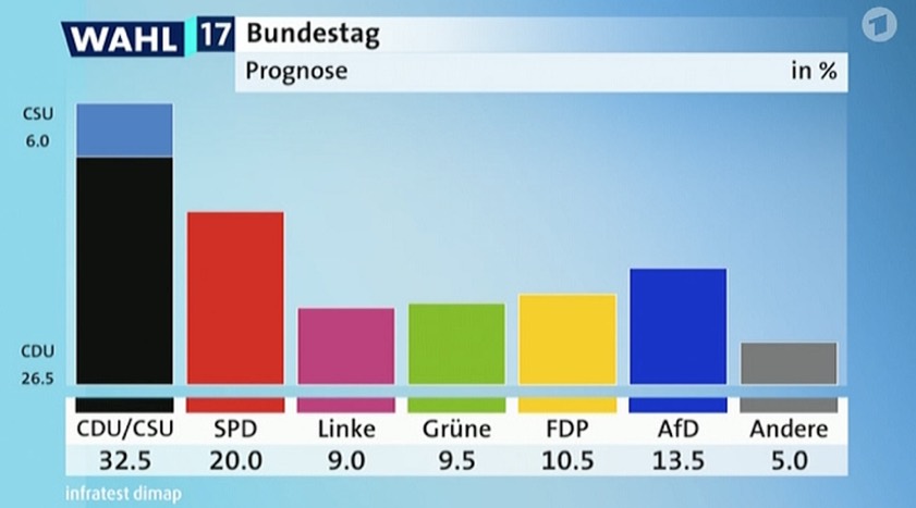 18.43 Uhr: Mit Blick auf die aktuellsten Hochrechnungen wird darauf hingewiesen, dass damit im Grunde nur zwei mögliche Koalitionen im deutschen Bundestag möglich sind. Erstens: Die so genannte große Koalition von CDU/CSU und SPD – wobei die SPD ja bereits erklärt hat, dass sie in die Opposition gehen will. Zweitens: Das so genannte Jamaika-Bündnis von CSU/CDU, FDP und Grünen.