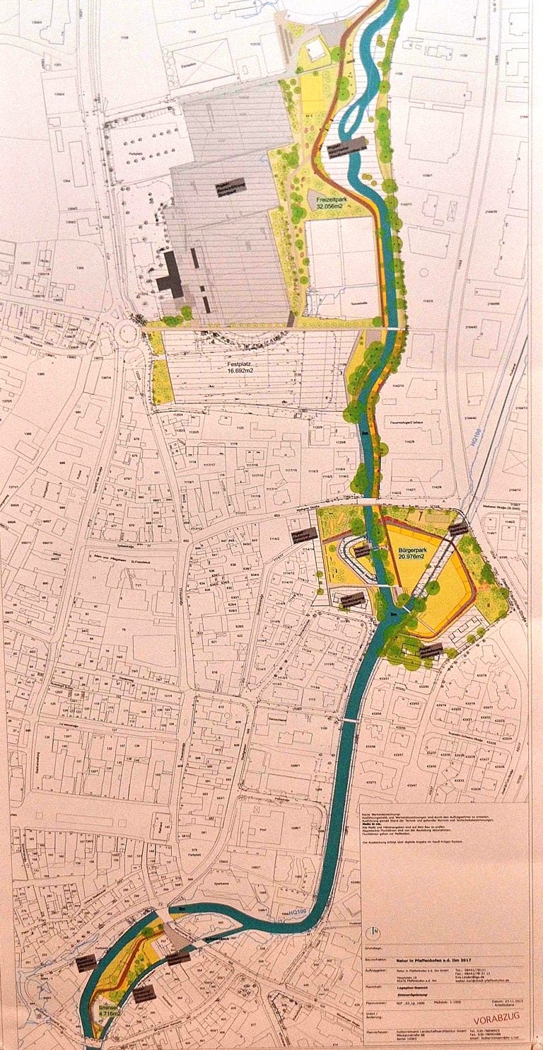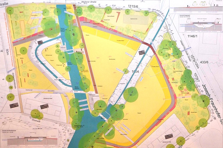 Die Garten- und Landschaftsarchitektin Barbara Hutter erläuterte anhand umfangreichen Kartenmaterials den derzeitigen Planungsstand mit dem gesetzten Ziel eines "komplett veränderten, neuen Ilmraums" So werde es etwa eine Ilm-Promenade mit blühenden Sträuchern geben, die "Leichtigkeit" vermittelten und zum Verweilen einladen". Wasser sei nicht nur im Bürgerpark sondern auch bei der Gesamtschau ein prägendes Element. Hinsichtlich des unattraktiven Flutgrabens seien zwar wasserwirtschaftliche Aspekte bei der Gestaltung zu beachten, doch es gebe Hoffnung, dass sich später einmal eine "Bewegung im Gerinne" zeigen werde. Für die Ilminsel seien großzügige Bereiche mit vielen Sitzmöglichkeiten angedacht. Auch einen Trauerbaum werde es – einem Wunsch des hiesigen Hospizvereins folgend – geben.