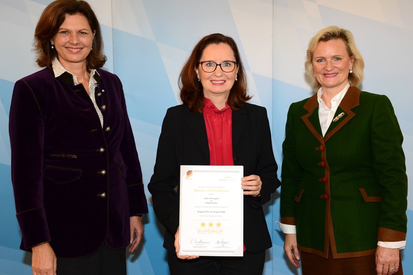 (ty) Bayerns Wirtschafts- und Tourismusministerin Ilse Aigner (Foto oben, links) sowie die Präsidentin des bayerischen Hotel- und Gaststättenverbands, Angela Inselkammer (rechts), haben kürzlich in München Sterne-Klassifizierungen an 74 Hotels, Gasthäuser und Pensionen im Freistaat verliehen – unter ihnen auch das Pfaffenhofener Hotel Alea, vertreten durch Sylvia Apfl (Mitte). Das noch junge Pfaffenhofener Haus trägt nun die Klassifizierung „Drei Sterne superior“.
