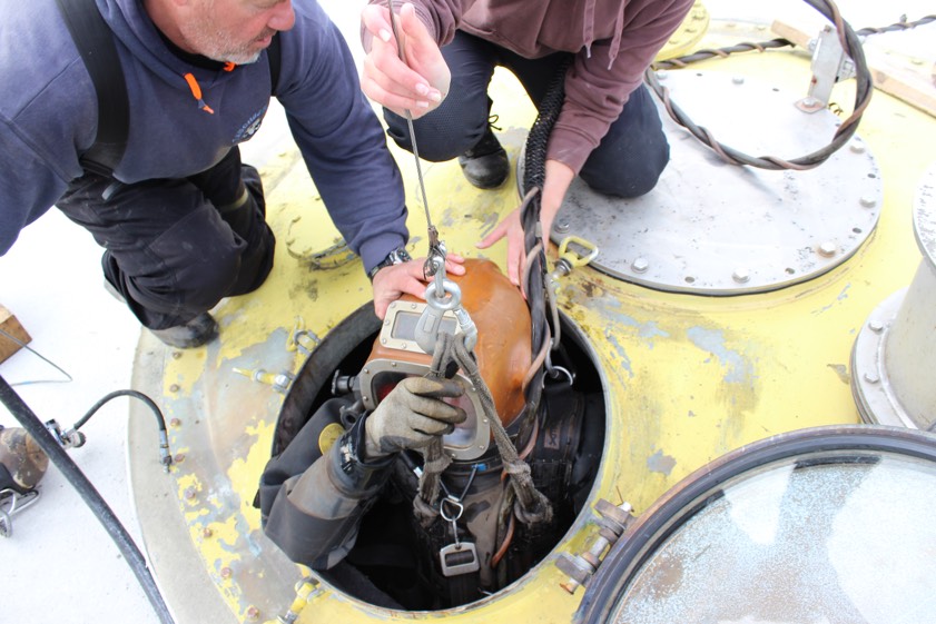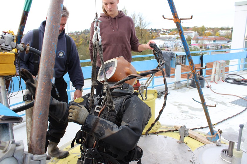 Das kleine Glasfenster im Helm des etwas altertümlich aussehenden Taucheranzugs beschlägt ein wenig, schon bevor der Berufstaucher überhaupt eingestiegen ist. Doch Grund zur Sorge besteht nicht. Oben kümmern sich insgesamt vier weitere Kollegen, drei Männer und eine Frau, um die Sicherheit des Tauchers in dem Faulturm. Der wird über einen Schlauch mit komprimierter Luft versorgt und hat für alle Fälle noch eine Reserveflasche bei sich. Außerdem kühlt Wasser seinen Taucheranzug. "Denn weil es im Faulturm gärt, herrschen dort Temperaturen um die 37 Grad Celsius", sagt Hollenberger.