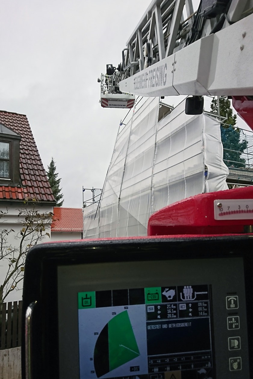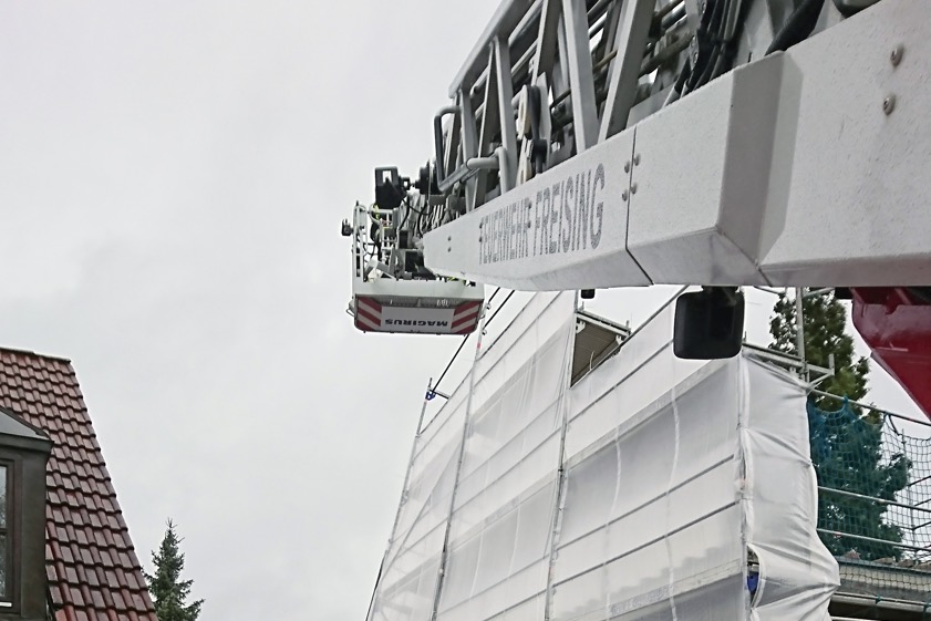 (ty) Gegen 10 Uhr haben heute Vormittag Passanten die Feuerwehr verständigt, weil in der Alois-Steinecker-Straße in Freising ein Baugerüst gefährlich in Schieflage geraten war und umzustürzen drohte. „Durch die enorme Windlast der Orkanböen des Sturmtiefs Herwart hatten die Verankerungen des mit Planen verkleideten Gerüsts versagt“, berichtet ein Feuerwehr-Sprecher.