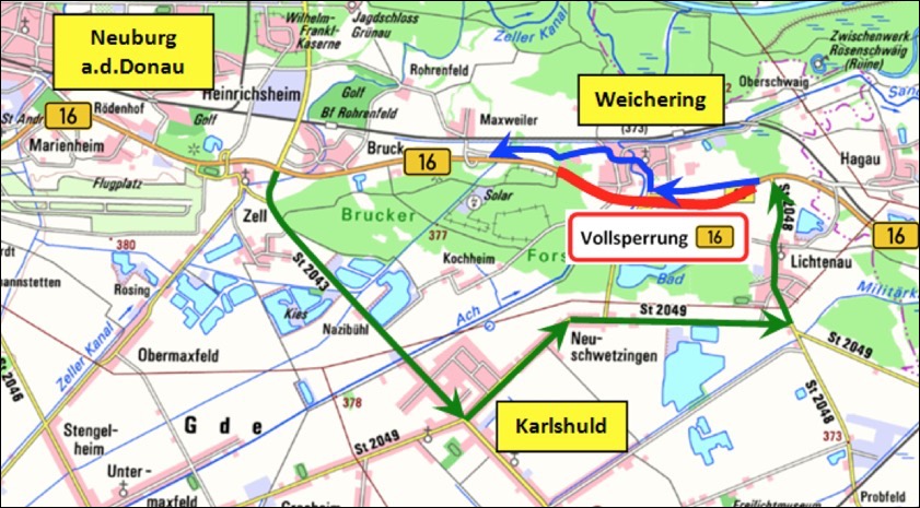 Die Vollsperrung soll nach aktuellen Angaben bis voraussichtlich Freitag, 15. Dezember, dauern. Der Verkehr aus Richtung Neuburg nach Ingolstadt wird in dieser Zeit ab der Zeller Kreuzung über die Staatsstraße 2043 – Kreisverkehr Karlshuld – Staatsstraße 2049 – Neuschwetzingen – Staatsstraße 2048 – Lichtenau und dann zurück auf die B 16 geführt.