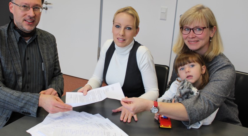 Stadtjurist Florian Erdle nahm die Unterschriftenlisten der Kita-Eltern entgegen, die ihm die neue Vorsitzende des Gesamtelternbeirats, Sabrina Fischer (Mitte), und ihre Vorgängerin Marion Buchner (mit Tochter Livia) überreichten.