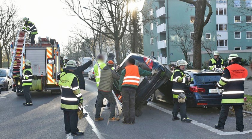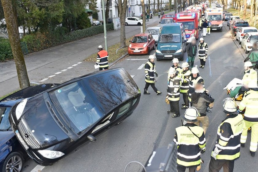 (ty) Ein 66-jähriger Pkw-Fahrer hat am heutigen Nachmittag einen spektakulären Unfall in München unverletzt überstanden. Der Mann war nach Angaben der Berufsfeuerwehr mit seinem Mercedes stadtauswärts auf der Schönstraße unterwegs, als es kurz vor 15 Uhr geschah. Aus bisher ungeklärter Ursache geriet er ins Schleudern und schrammte an der rechten Straßenseite an geparkten Autos entlang. Ein Zusammenstoß mit einem abgestellten BMW stoppte die Fahrt. „Der Mercedes stand schräg auf zwei Reifen auf der Schönstraße. Der Rest des Fahrzeugs war auf den geparkten BMW aufgefahren“, heißt es im Bericht der Feuerwehr – und die Fotos veranschaulichen das Malheur eindrucksvoll.