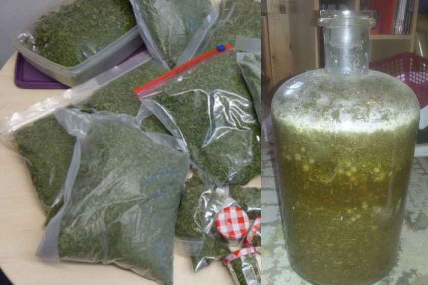 Während der Durchsuchung geriet ein in der Wohnung anwesender 59-jähriger Mann ins Visier der Ermittler. Bei ihm fanden die Drogenfahnder letztlich auch noch Rauschmittel. Er hatte Marihuana im mittleren zweistelligen Grammbereich in kleinen Gläsern portioniert und nach eigenen Angaben für Weihnachten als Präsente vorbereitet. Zudem hatte er eine Flasche mit etwa fünf Litern Marihuana-Bowle angesetzt. Auch hier war die Beschlagnahme des Betäubungsmittels die unmittelbare Folge. Beide Personen müssen sich nun wegen Verstößen gegen das Betäubungsmittelgesetz verantworten. (Fotos: Polizei)