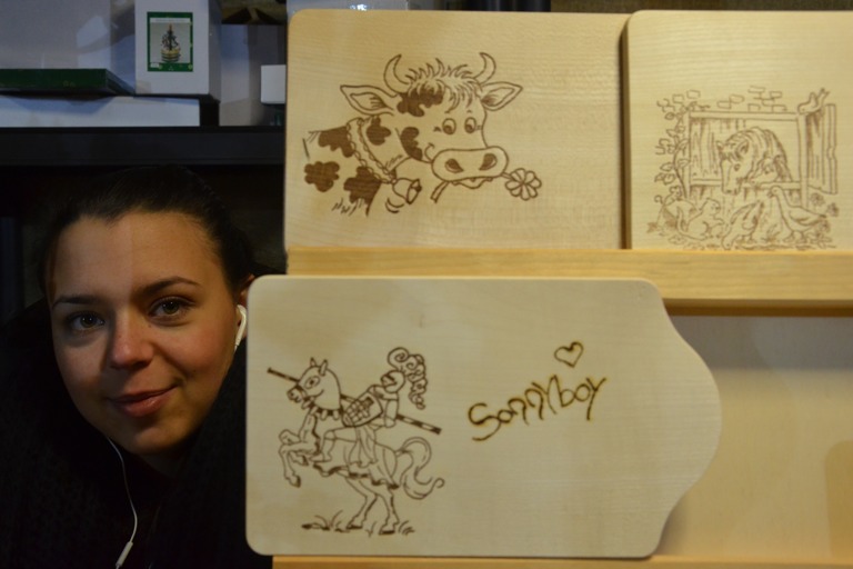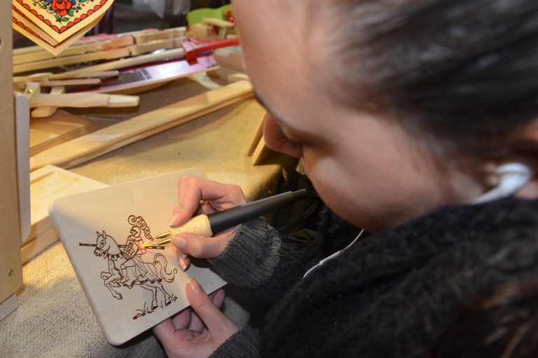 Unter den Fieranten ist auch die 19-jährige Samira Bauer aus Freiburg, nach Aussagen ihres Vaters die jüngste Holzbrennerin Deutschlands. Sie brennt mit einem speziellen Werkzeug mit glühender Spitze auf Wunsch individuelle Muster oder Schriftzüge ins Holzgegenstände. Da gibt es zum Beispiel Kinderschwerter mit dem Namen des jungen Ritters drauf oder ein Brotzeitbrettl mit Verzierung ganz nach Bestellung der Kunden.