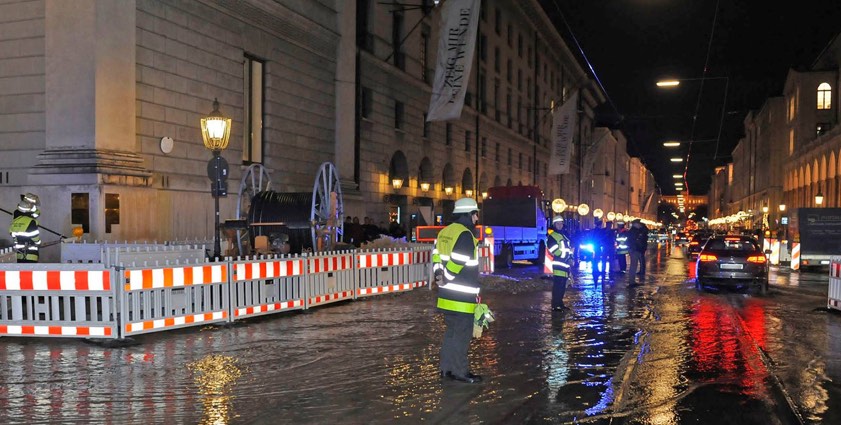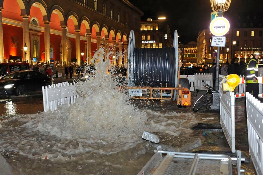 (ty) Am gestrigen Abend gegen 18 Uhr stellten Beamte der Bereitschaftspolizei eine größere Menge Wasser im Bereich der Münchner Maximilianstraße fest. Das Wasser trat aus einer Baugrube beim Nationaltheater aus. Ein 58-jähriger Verantwortlicher, den die Gesetzeshüter dort antrafen, habe erklärt, dass im Auftrag der Stadt in der Baugrube ein Rohr verlegt werden sollte. Während dieser Arbeiten sei allerdings eine andere Wasserleitung mit einem Durchmesser von 30 Zentimetern beschädigt worden. Das Ergebnis waren eine Wasser-Fontäne und eine Überflutung.