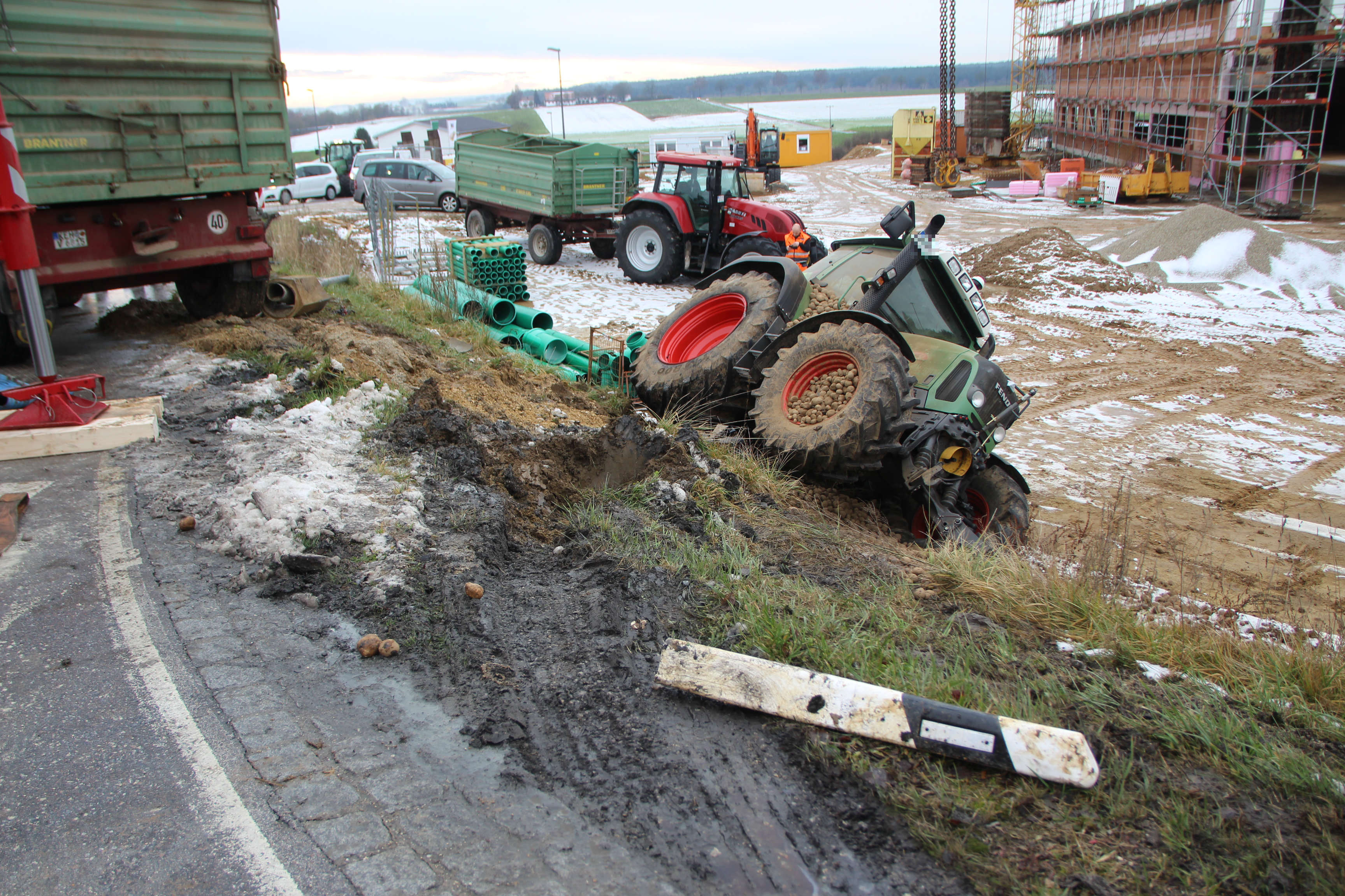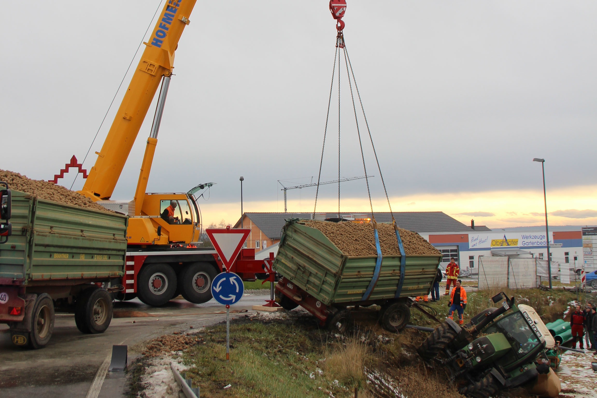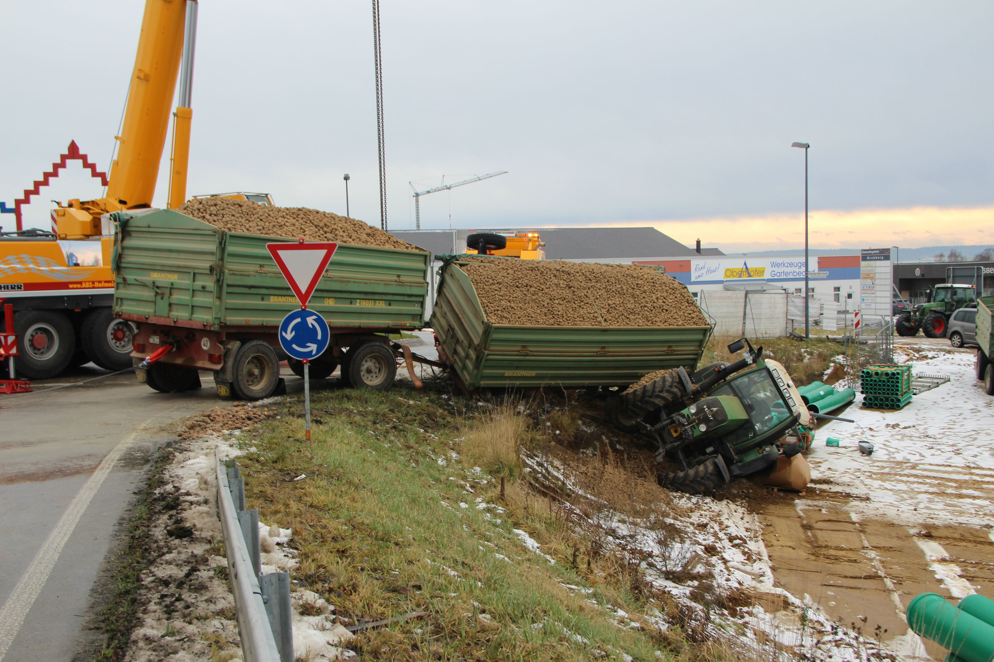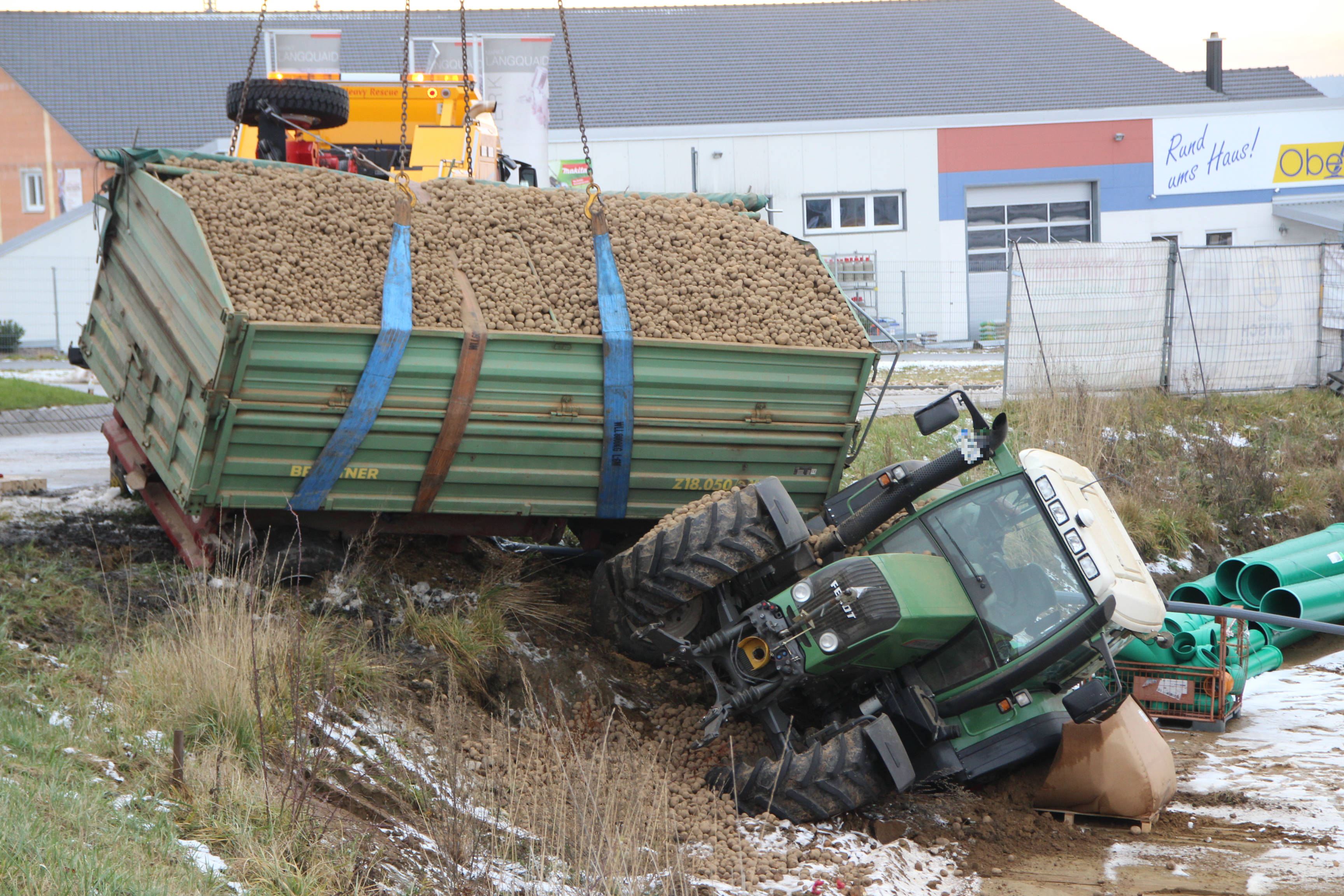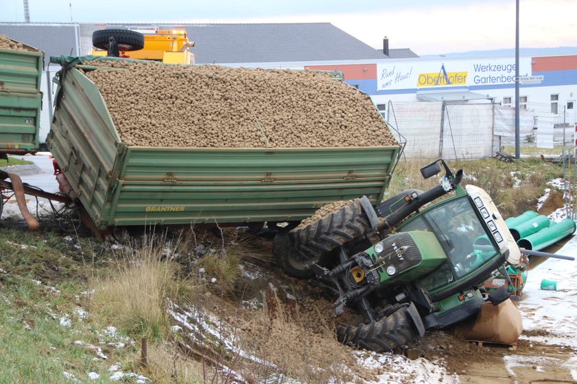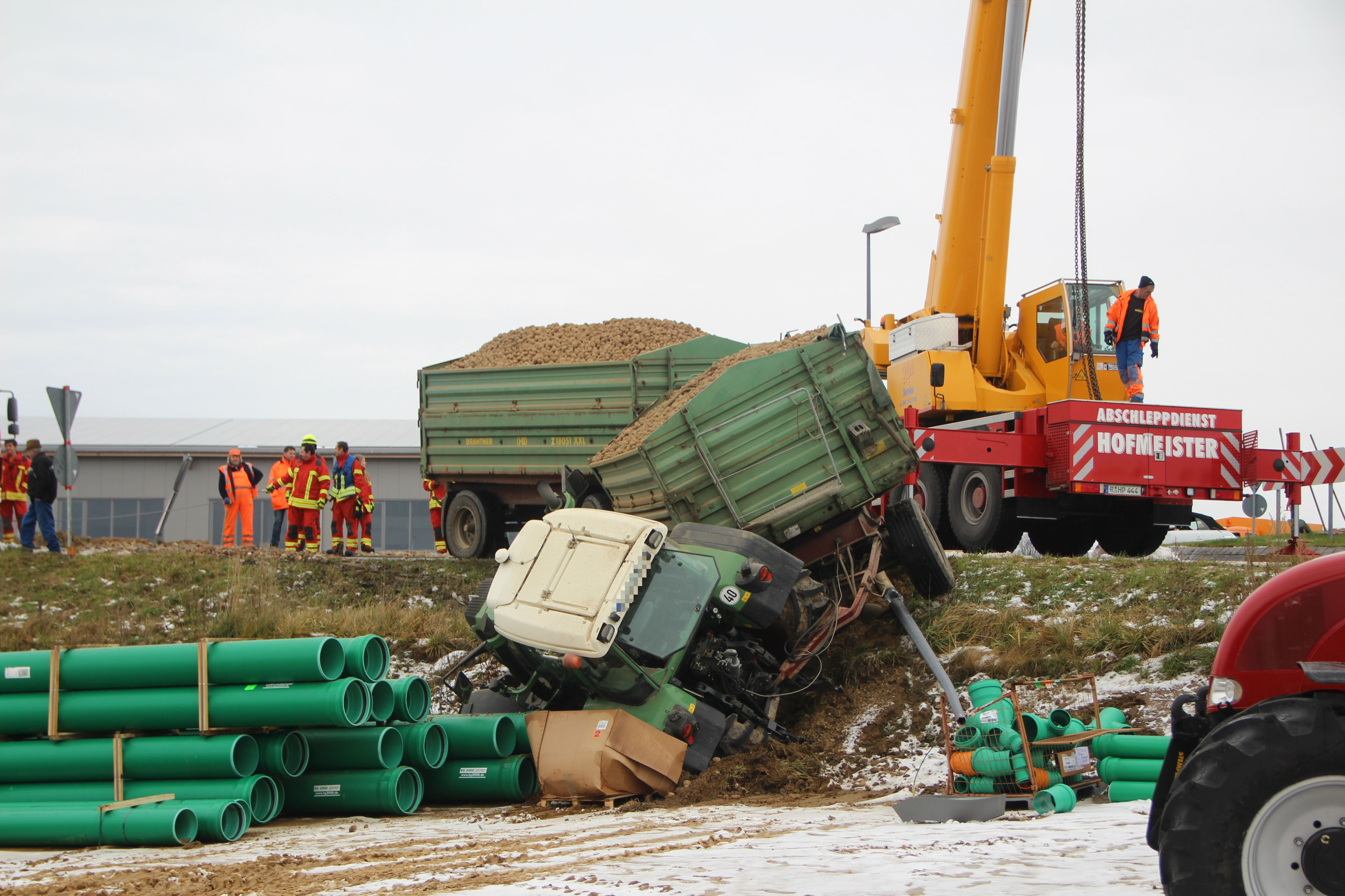 Nach heutigen Angaben der Polizei war viel Glück im Spiel, dass der Anhänger nicht auf den Traktor kippte. Der 79-Jährige blieb somit unverletzt, wie heute bestätigt wurde. Die örtliche Feuerwehr, der Bauhof und ein Bergungs-Unternehmen mit Kran rückten an. Eine großflächige Ölspur musste außerdem beseitigt werden. Der Sachschaden bewege sich nach vorläufigen Schätzungen um etwa 4000 Euro, hieß es heute von der Polizei. Die Bergung war aufwändig, weil das Gespann zunächst gegen ein weiteres Abrutschen gesichert werden musste.