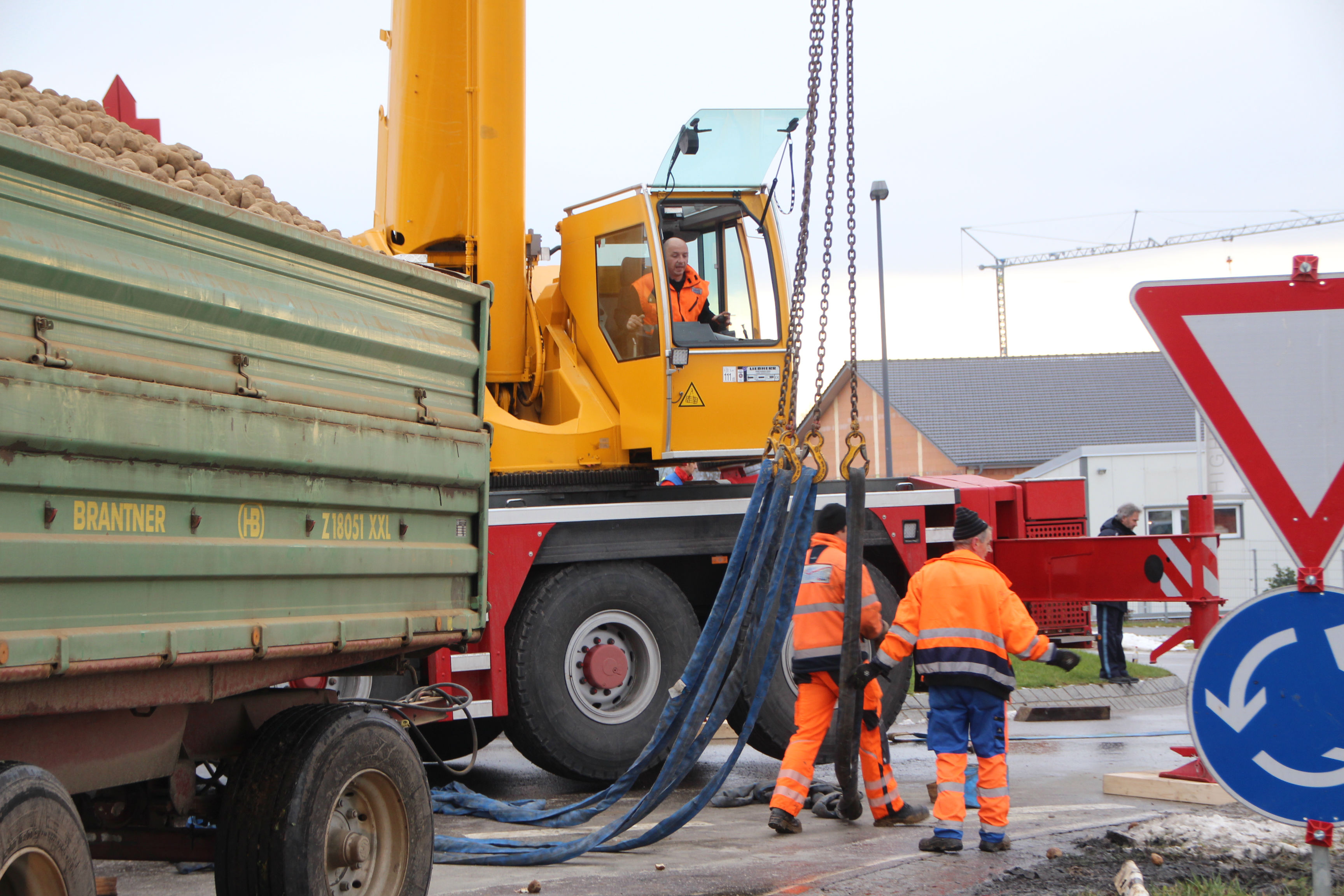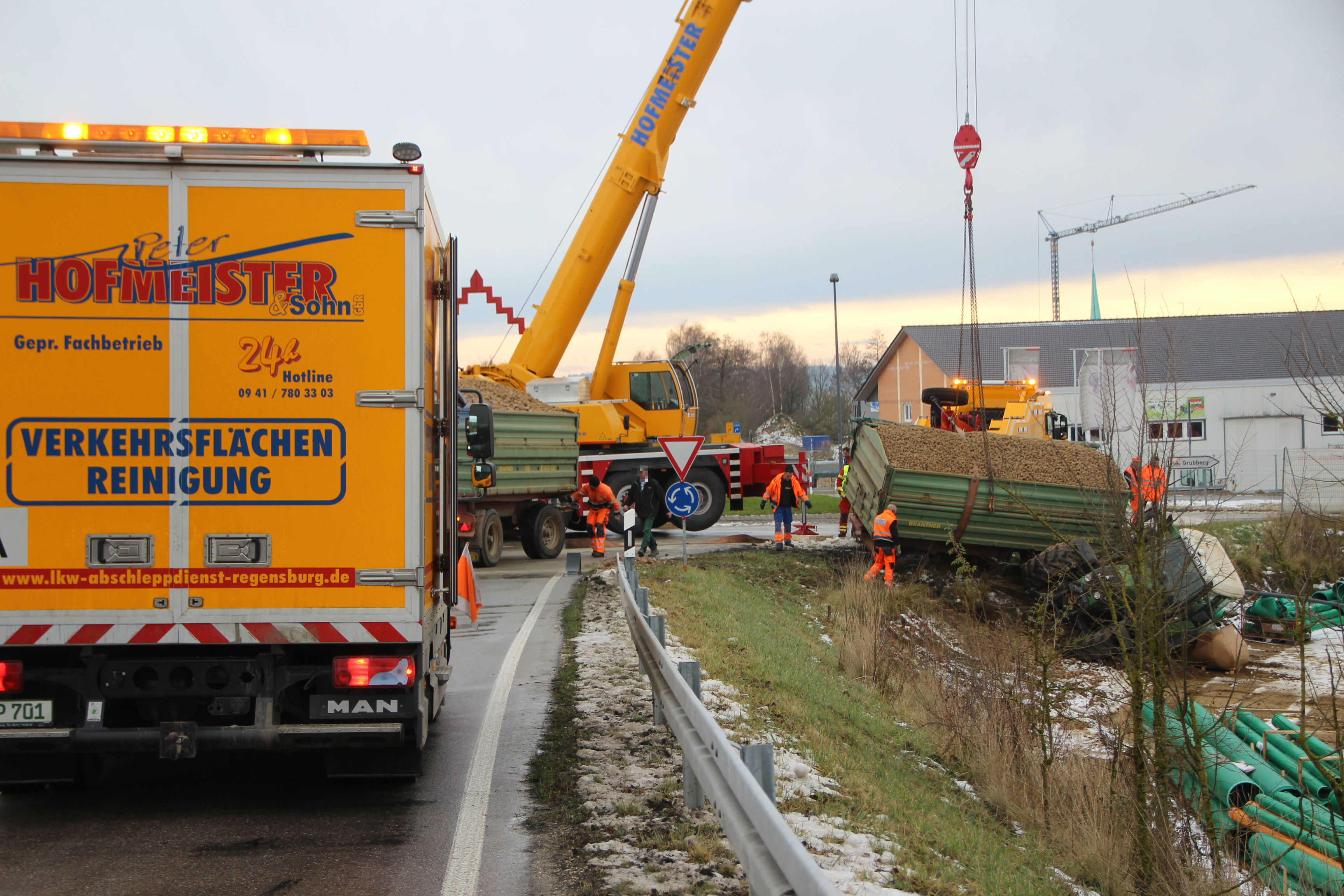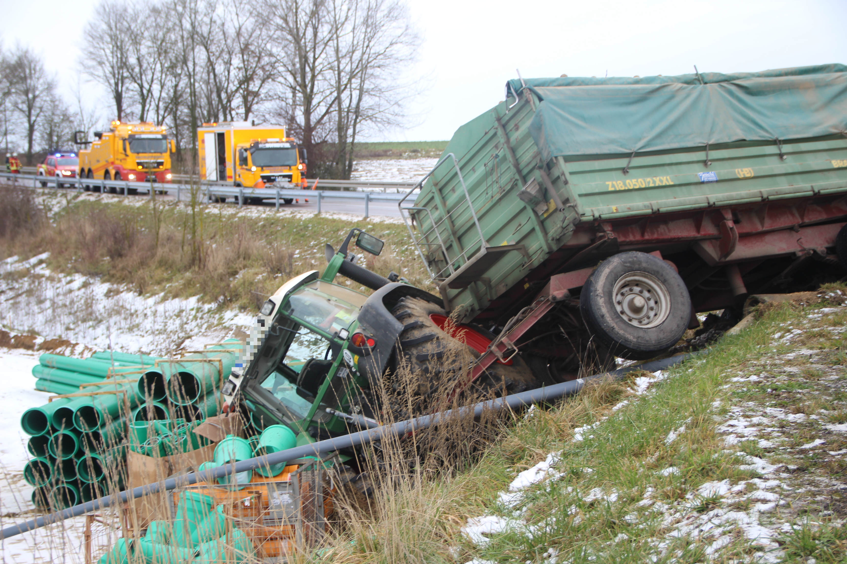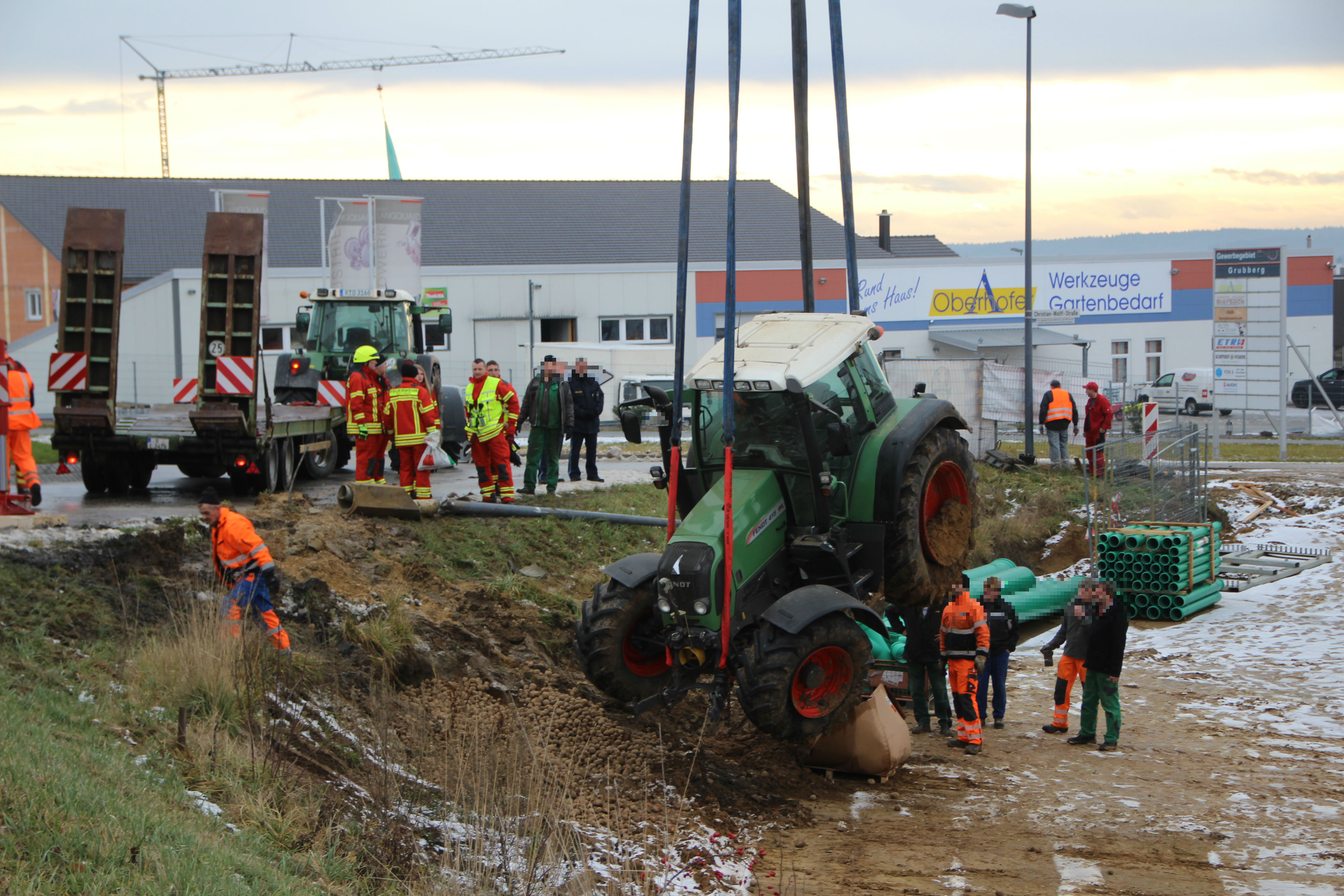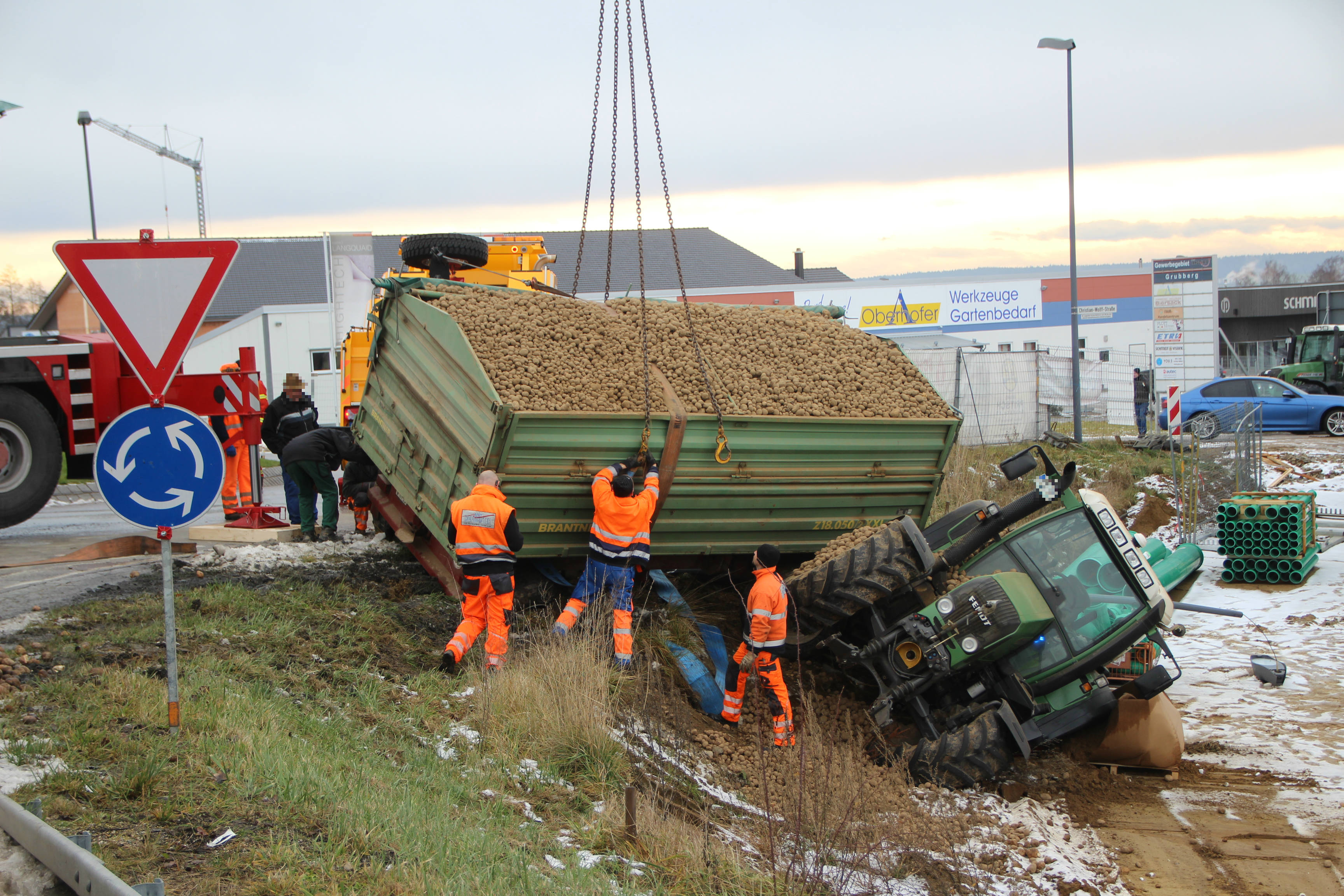 Nach heutigen Angaben der Polizei war viel Glück im Spiel, dass der Anhänger nicht auf den Traktor kippte. Der 79-Jährige blieb somit unverletzt, wie heute bestätigt wurde. Die örtliche Feuerwehr, der Bauhof und ein Bergungs-Unternehmen mit Kran rückten an. Eine großflächige Ölspur musste außerdem beseitigt werden. Der Sachschaden bewege sich nach vorläufigen Schätzungen um etwa 4000 Euro, hieß es heute von der Polizei. Die Bergung war aufwändig, weil das Gespann zunächst gegen ein weiteres Abrutschen gesichert werden musste.