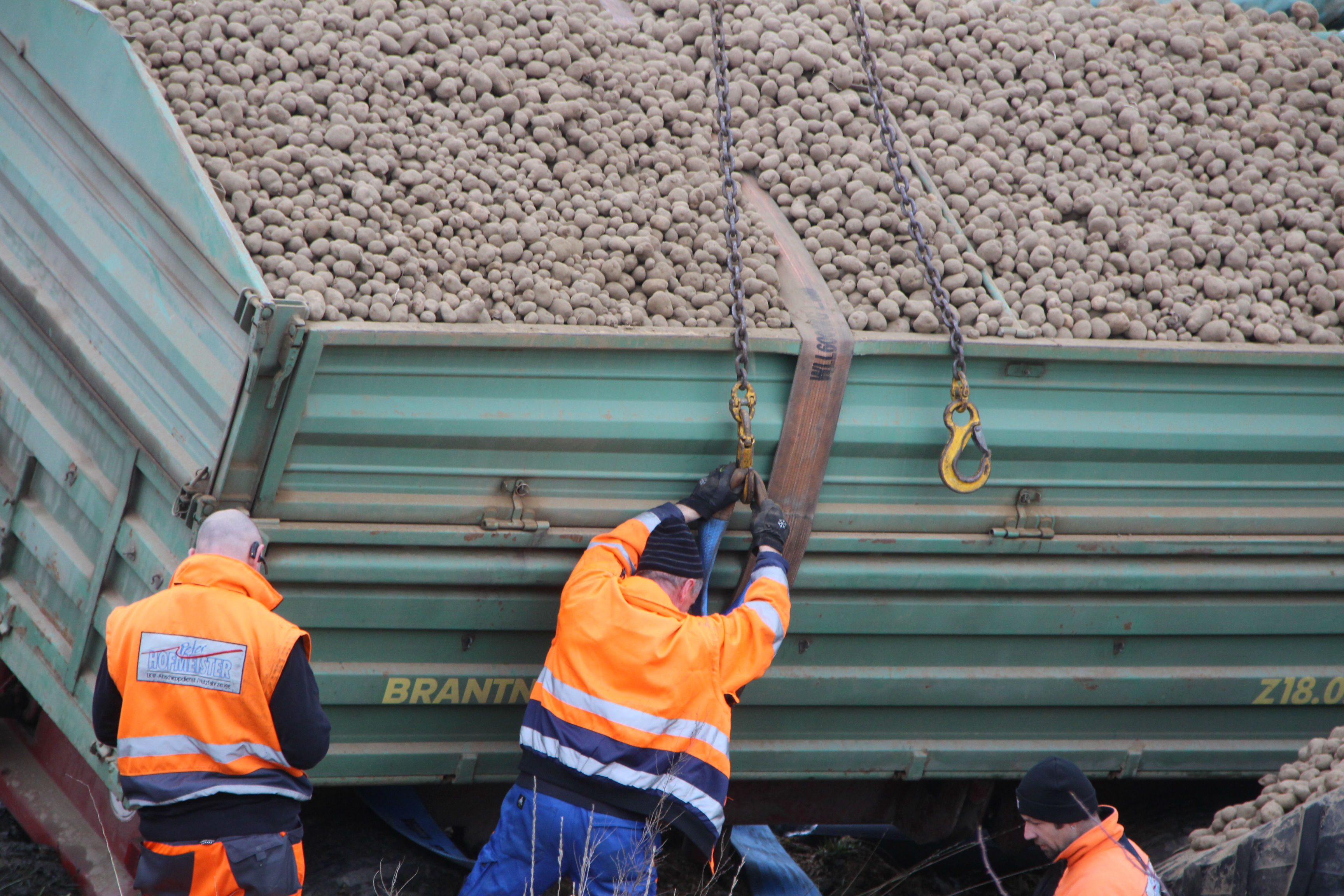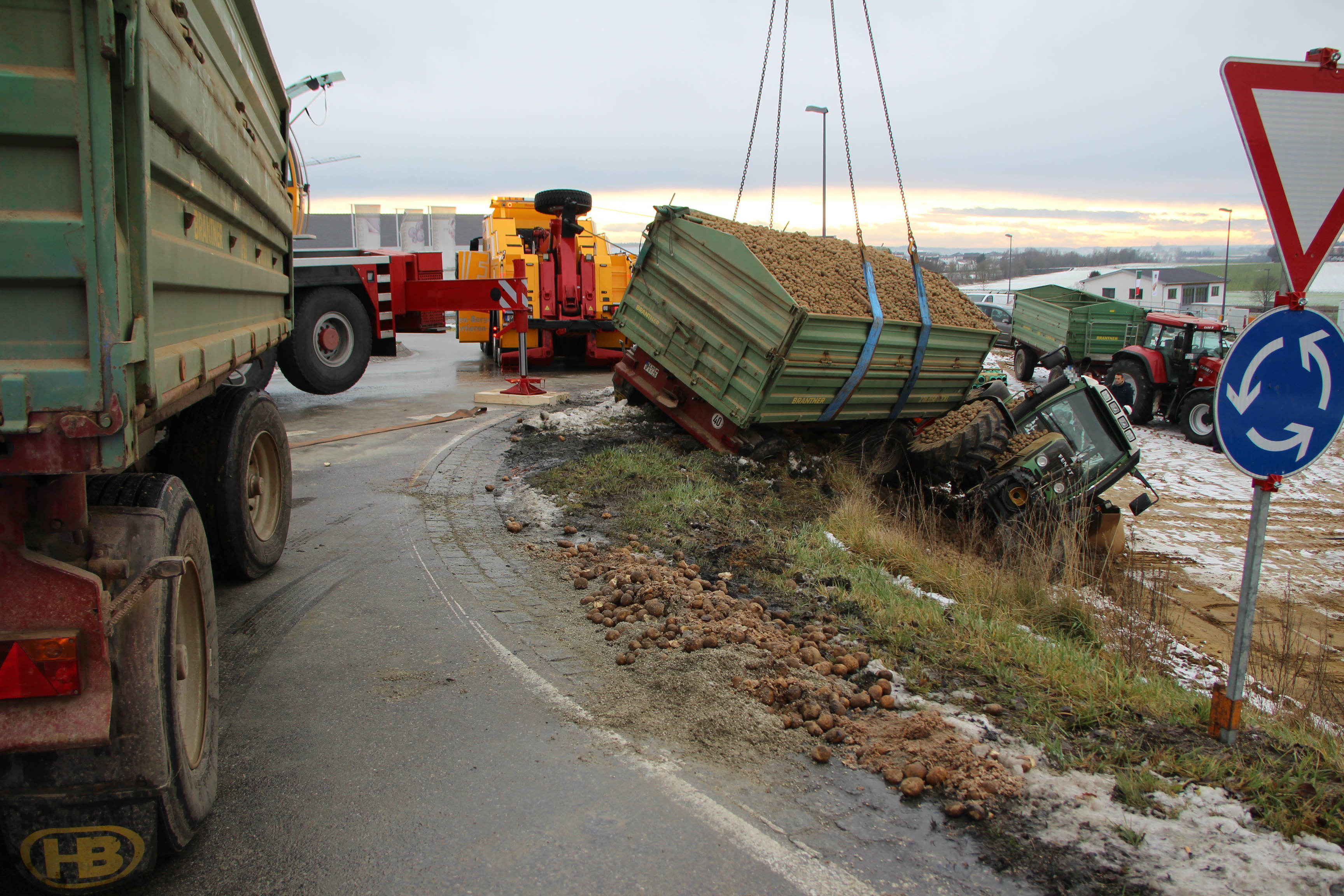 Aufgrund der Wucht wurde der Traktor von den nachschiebenden Anhängern, welche mit Kartoffeln voll beladen waren, gedreht sowie die angrenzende steile Böschung hinabgedrückt. „Das Gespann kollidierte mit einer Laterne und beschädigte dort gelagertes Baumaterial einer nahegelegenen Baustelle.“ Durch den Aufprall löste sich ein Anhänger von der Deichsel und wurde auf den Traktor geschoben.