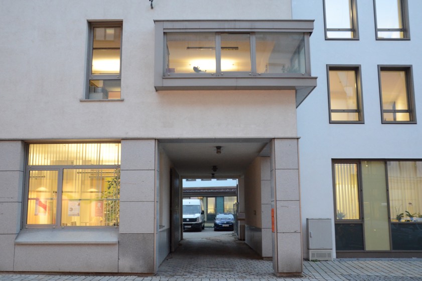 Diese schmälere Durchfahrt zum Innenhof ist für Pkw-Lenker vermutlich nicht ganz so bequem, aber zu bewältigen. Von Landkreis-Seite muss man ein bisschen umplanen, doch das sei in den Griff zu bekommen, befand Kreiskämmerer Walter Reisinger. Im Innenhof fällt, so wurde heute erklärt, ein Stellplatz weg. Außerdem müssen die Fahrrad-Ständer, die eigentlich in der Verbindung zur Ingolstädter Straße hätten aufgestellt werden sollen, woanders hin. Der Hofberg, wo das Landratsamt ein paar weitere Stellplätze vorhält, soll zwar im Zuge des Verkehrs-Konzepts ebenfalls für die Durchfahrt gesperrt werden (denn sonst könnte man die Sperrung der Hauptplatz-Durchfahrt ja umfahren), aber das wirkt sich kaum auf die Parkplätze dort aus.