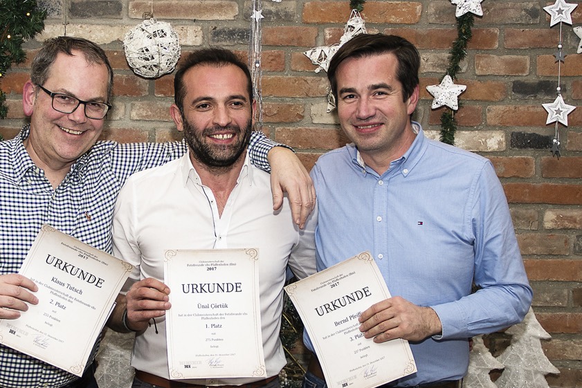 (ty) Der diesjährige Klubmeister der Pfaffenhofener Fotofreunde heißt Ünal Çörtük. Er war mit 275 Punkten praktisch nicht mehr einzuholen. Klaus Tutsch folgt auf dem zweiten Platz mit 255 Zählern vor Bernd Pfeiffer auf dem dritten Platz mit 237 Punkten. Philipp Hayer, der Vorsitzende der "Fotofreunde VHS Pfaffenhofen", überreichte im Rahmen der Weihnachtsfeier den drei Bestplatzierten ihre Urkunde und beglückwünschte sie. Zudem bedankte er sich bei allen aktiven Mitgliedern für das grandiose Vereinsjahr, welches viele Erfolge bescherte. Genau dort will der Klub im nächsten Jahr weitermachen und weitere Projekte starten. Infos zu den Fotofreunden gibt es unter www.fotofreunde-paf.de.