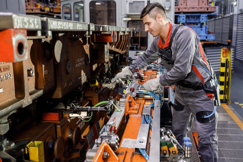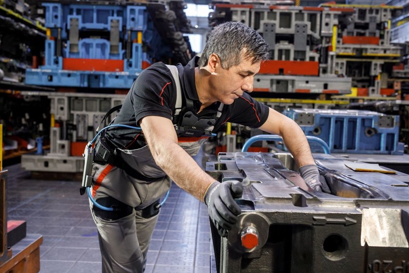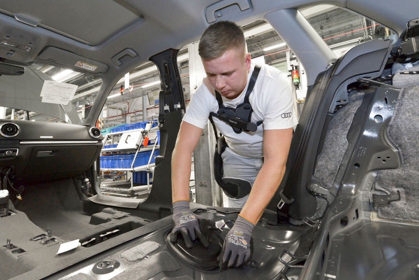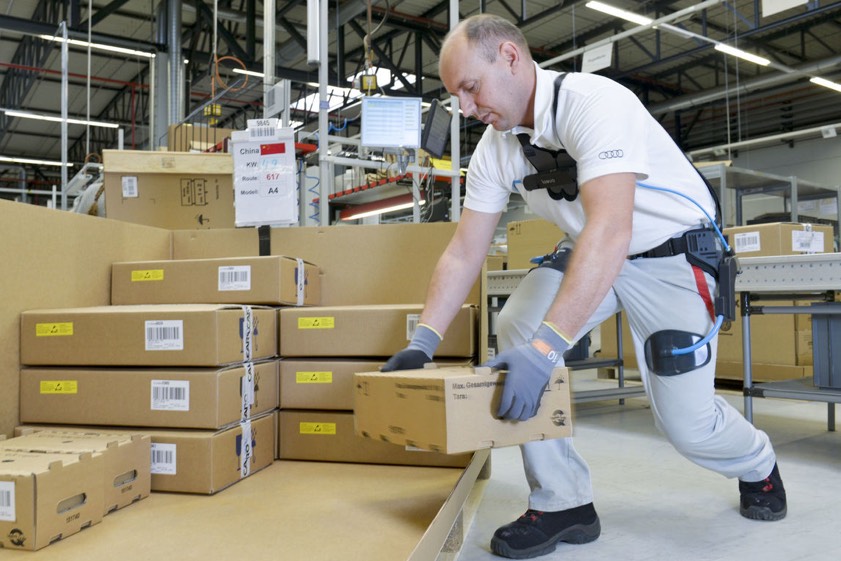 Audi-Beschäftigte testen derzeit ein ergonomisches Hilfsmittel, das beim Heben und Tragen von schwerem Material unterstützt sowie die Rückenmuskulatur entlastet.