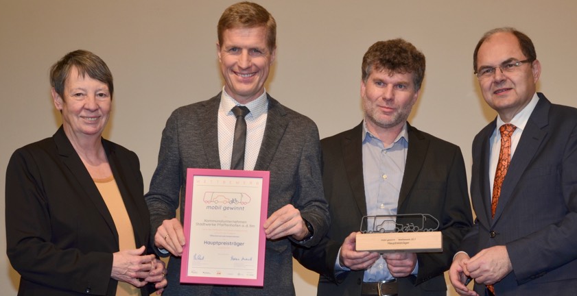 Bei "mobil gewinnt" – einer gemeinsamen Initiative des Bundesverkehrs- und des Bundesumweltministeriums – werden besonders innovative und kluge Ideen für umweltschonende Mobilität prämiert. Preise werden in verschiedenen Kategorien vergeben: "kleine und mittlere Betriebe", "Großbetriebe", "überbetriebliche Verbund-Projekte" und "öffentlich-private Kooperationen". In letztgenannter Kategorie haben die Pfaffenhofener Stadtwerke mit ihrem Mobilitätskonzept überzeugt.