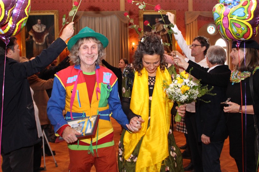 (ty) Eine außergewöhnlich bunte Hochzeit ging am gestrigen Nachmittag im Festsaal des Pfaffenhofener Rathauses über die Bühne, als GfG-Stadtrat Manfred „Mensch“ Mayer und Kerstin Kamm sich vor dem Standesbeamten und Dritten Bürgermeister Roland Dörfler (Grüne) das Ja-Wort gaben. Die Hochzeitsgäste standen mit roten Rosen und bunten Schmetterlings-Ballons Spalier.