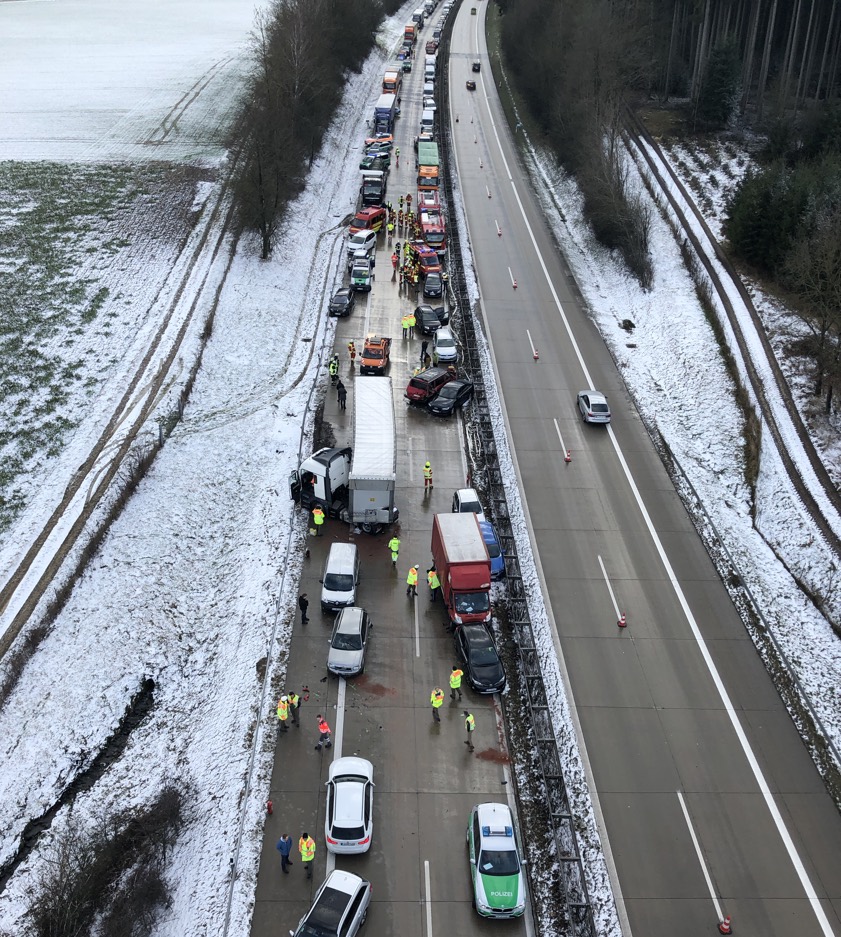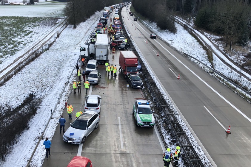 Was war passiert? Gegen 11.45 Uhr war den ersten Angaben der Polizei zufolge ein Pkw, der in Richtung Regensburg unterwegs war, aufgrund der Schneeglätte ins Schleudern geraten und letztlich in die Leitplanke gekracht. Die nachfolgenden Fahrzeuge konnten dann – ebenfalls wegen der Straßenverhältnisse – nicht mehr rechtzeitig anhalten: Sie fuhren teilweise auf oder prallten in die Leitplanken.