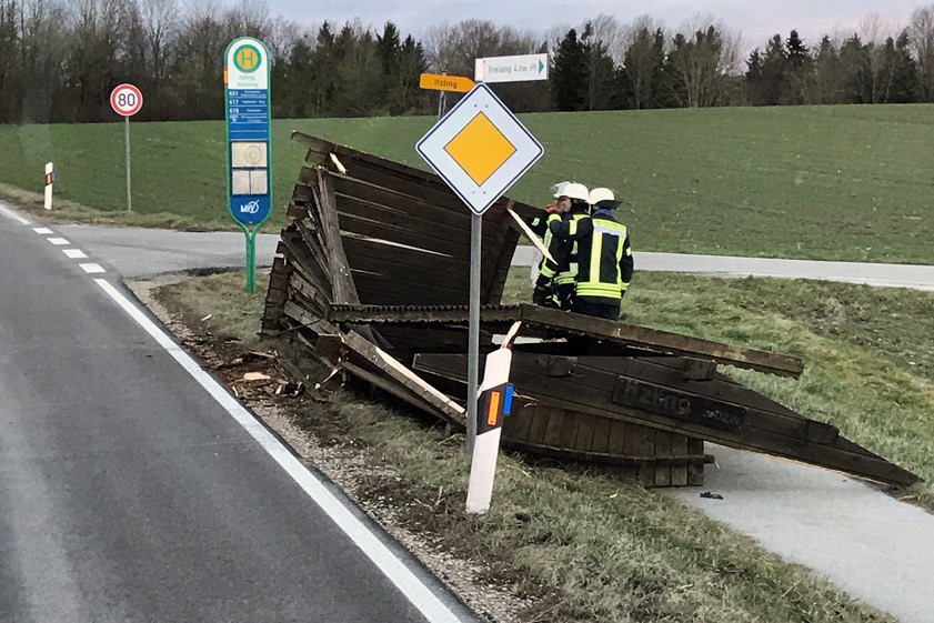 Kurios war ein Einsatz auf der Kreisstraße FS9: Auf Höhe von Untergartelshausen hob das Bushäuschen ab, flog quer über die Straße und blieb auf dem Radweg liegen (Foto ganz oben). Die Feuerwehr räumte die Teile von Radweg und Straße und beseitigte so die Gefahr. Insgesamt war die Feuerwehr Freising zwischen 13.45 und 18.15 Uhr mit sechs Fahrzeugen und etwa 30 Einsatzkräften im Einsatz.