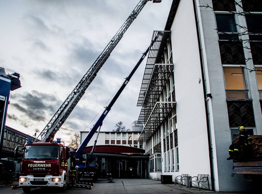 In Freising wurde gegen 15 Uhr am Josef-Hofmiller-Gymnasium durch eine Sturmböe das Wellblechdach angehoben und teilweise verformt. "Auf einer Länge von rund 25 Metern wurde die Blecheindeckung abgehoben und flatterte im Wind. Es bestand akute Absturzgefahr", berichtet die hiesige Feuerwehr. Der Bereich um die Schule wurde sofort gesperrt. Zur Sicherung war auch das Technische Hilfswerk (THW) im Einsatz. Schüler und Lehrer konnten das Gebäude durch einen Nebeneingang sicher verlassen.