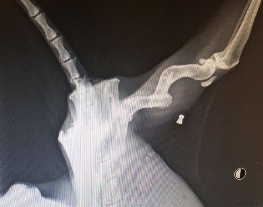 Bei den anschließenden Röntgen-Untersuchungen zeigten sich laut einer aktuellen Mitteilung des Tierschutzvereins bei der Katze „nicht nur ein alter Oberschenkelbruch sowie ein Oberschenkelhalsbruch am anderen Bein, sondern auch ein noch in ihr steckendes Luftgewehr-Projektil“. Schübel: „Offensichtlich wurde auf die Katze geschossen. Zusätzlich liegt die Vermutung nahe, dass ihr auch die Brüche absichtlich zugefügt wurden.“ Die Tierschützer veröffentlichten dazu auch ein Röntgenbild.