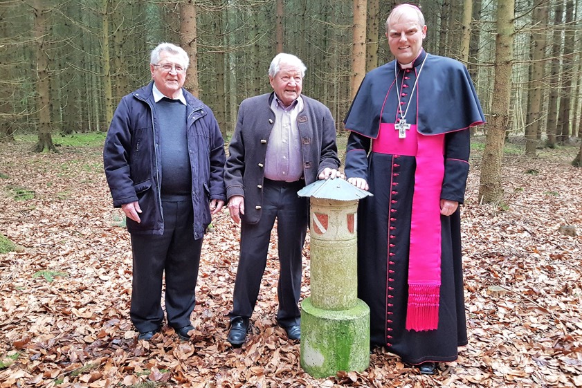 Pater Alois Gurtner (links), Franz Krammer und Weihbischof Florian Wörner besuchen den Grenzstein der drei Diözesen München-Freising, Augsburg und Regensburg im Lustholz bei Riedhof. Krammer hatte diesen Grenzstein im Jahr 1989 selbst errichtet.