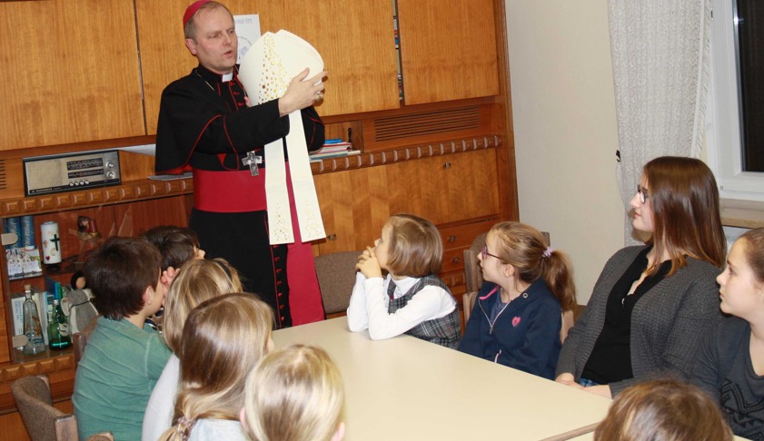 Weihbischof Wörner erläutert den Kindern der Pfarreien Affalterbach, Uttenhofen und Gundamsried die Symbolik von Mitra und Bischofsstab.