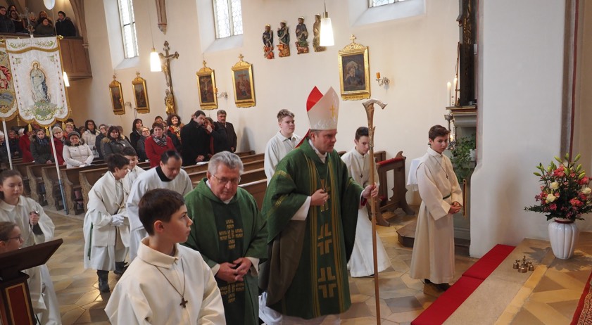 Das Evangelium im feierlichen Pontifikalamt am heutigen Sonntag in der Uttenhofener Pfarrkirche St. Sebastian gab dem Oberhirten aus dem Bistum Augsburg eine gute Möglichkeit, seine Gedanken über den Besuch des Herrn auszubreiten: Jesus hatte in der Synagoge von Kapharnaum mit einer „Power“ gepredigt, die nicht von einem Menschen kommen konnte. Wörner forderte die Gläubigen auf, diese Geschichte weiter zu schreiben: „Wenn wir unseren Glauben zur Sprache bringen, mache ich mir um die Zukunft unserer Kirche keine Sorgen!“