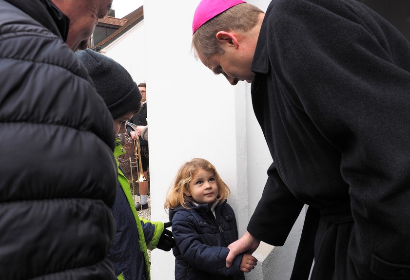 Ein buchstäbliches Bad in der Menge nahm der Weihbischof nach den Gottesdiensten. Viele Kinder und Erwachsene nahmen die Gelegenheit zum Dialog dankbar wahr. Die Frage, warum die Soutane des Bischofs denn genau 33 Knöpfe zählt, kam ebenso zur Sprache, wie aktuelle Entwicklungen in der katholischen Kirche. Wörner nahm zu allem geduldig Stellung und wusste die Gläubigen mit offenen und lockeren, aber auch verbindlichen Worten zu überzeugen.